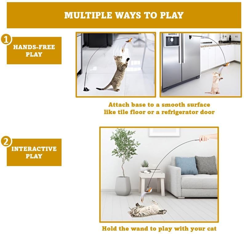 MULTIPLE WAYS TO PLAY: Our toy has 2 play modes: (1) interactive – you can hold the wand and play with your cat or (2) hands free – you can insert the wand in the suction cup base and let your cat enjoy self-play. This product is great if you have several cats in the household. Keeping your cats entertained also prevents destructive behaviors.