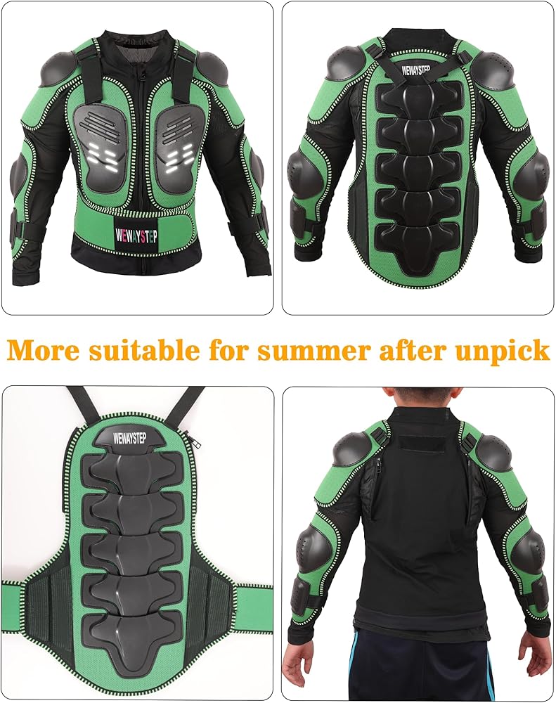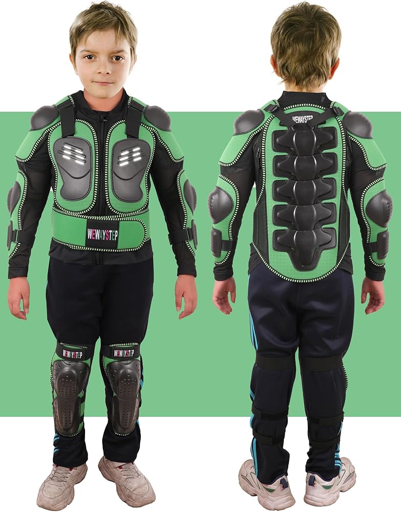3D Full Protection Design: This kids motorcycle jakcet provides full body armor spine, chest, shoulders, elbows, knees key parts cover the largest area of PP protective shell to prevent various injuries caused by accidental falls, providing comprehensive protection