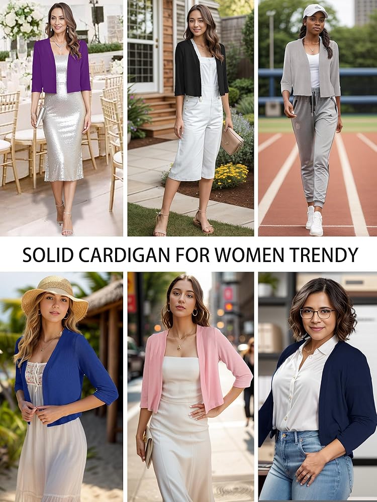 Features: Casual style, slim fit design, solid color, Open Front, ultra soft material, the 3/4 sleeves women Thin Shrugs are so comfy and flattering on all body types. You will love it and get lots of compliments on both.