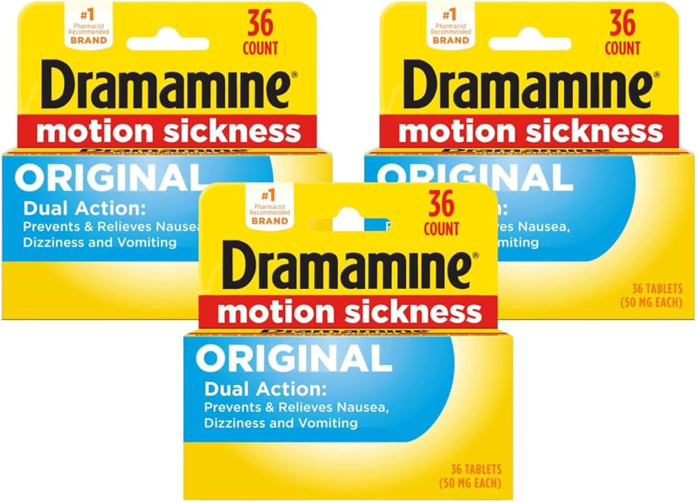 Dramamine Original Formula Motion Sickness Relief prevents and treats nausea, vomiting and dizziness. The tablets come in a 36 count box for anytime motion sickness symptoms strike on long family trips. Always bring Dramamine with you! You don't want to be caught in the air, on the water, or on the road without Dramamine. Depending on the cause, motion sickness is also referred to as airsickness, carsickness or seasickness. Here are some tips to help: Whether on a cruise ship, a jetliner or a sailboat - the middle of the vessel tends to be the steadiest. Stay mid-boat at sea or reserve a seat over the wings when flying to avoid too many nauseating ups and downs. If you know you are going on a rocky ocean-fishing adventure or helicopter tour that is likely to cause motion sickness, take Dramamine BEFORE boarding. Dramamine works best when taken as a precautionary measure. It also eases motion sickness after the fact, but why risk getting sick? Take a turn at the wheel. Driving the car or small watercraft may distract you from feeling nauseous. Ask your friends if you can act as a captain. If you begin to feel motion sick and can?t drive, at least sit in the front seat. You?ll feel better if you can face the direction in which you?re headed and stare at a non-moving object. Steer clear of fumes. Ferryboats, in particular, seem to chug out a lot of stinky exhaust that can make a seagoer go from slightly motion sick to all-out nauseated. Toast your besties with a glass of bubbly ginger ale or stick to bottled water and focus on staying hydrated. Avoid alcohol, which can increase dehydration and nausea. Not only is Dramamine the most trusted over-the-counter treatment for motion sickness, it is the Number One Pharmacist Recommended brand to both prevent and treat the condition.