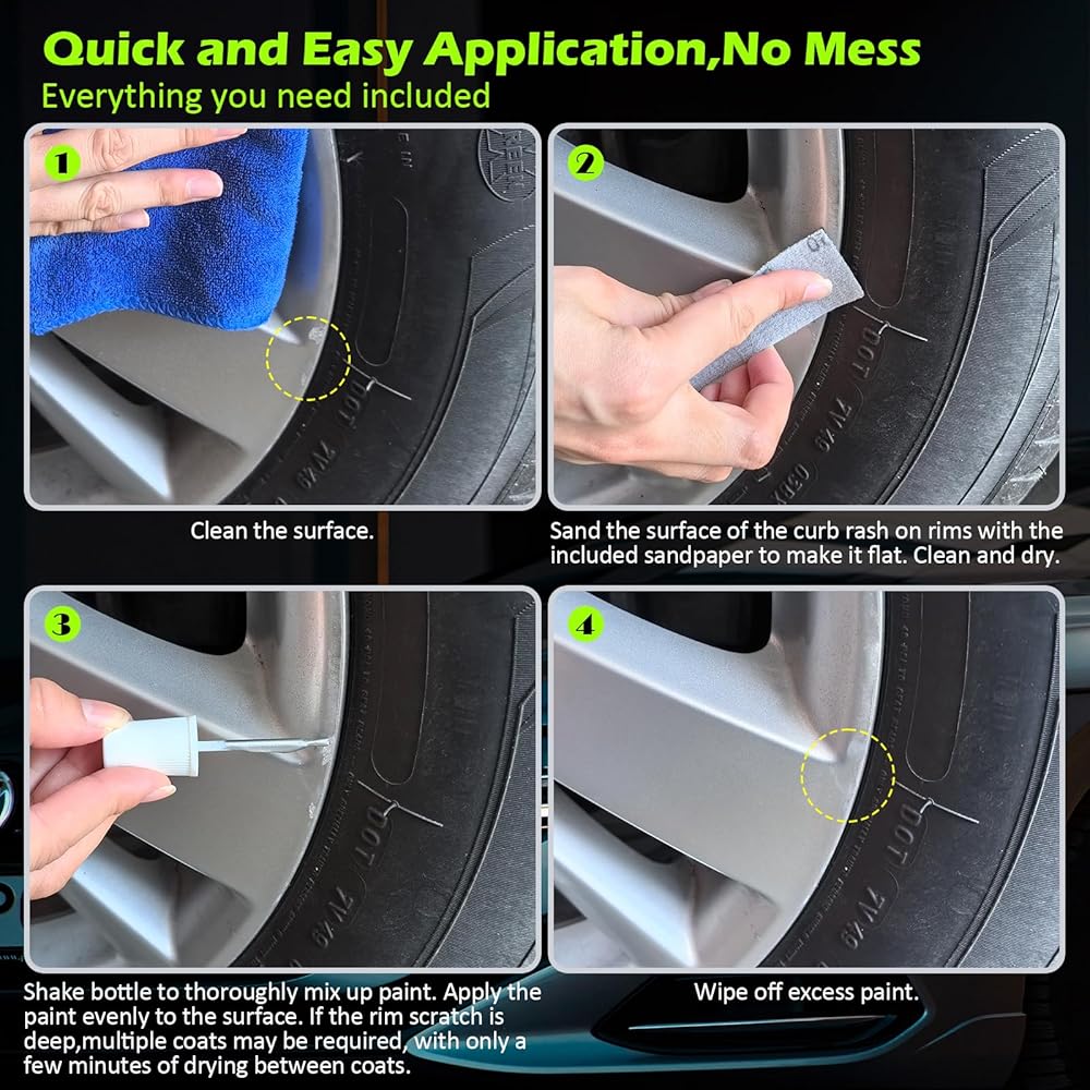 Quick and Easy Application:You can do your own wheel paint repair work without the help of a professional - Sand the surface of the curb rash on rims with the included sandpaper to make it flat, shake the bottle, apply the paint evenly to the surface. You can repeat the application, the paint dries in minutes.
