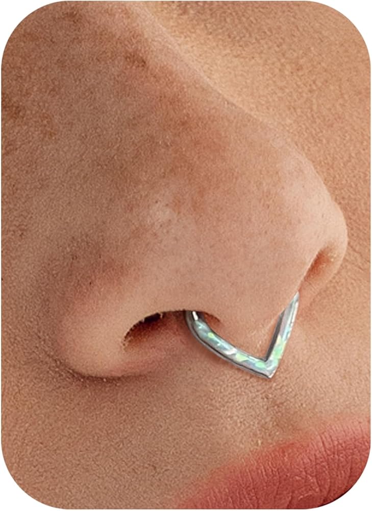Teardrop Hinged Septum Ring: Gauge size: 16G(1.2 mm); Inner diameter: 8 mm(0.31 inches); Color: Silver; Material: Genuine 316L stainless steel; One order includes 1 piece of septum ring that feature iridescent peaks with glittery white opal inlaid ;Please refer to our size chart for selecting the appropriate size; Don't worry if the size doesn't fit, we're here for you if you have any questions regarding the received item