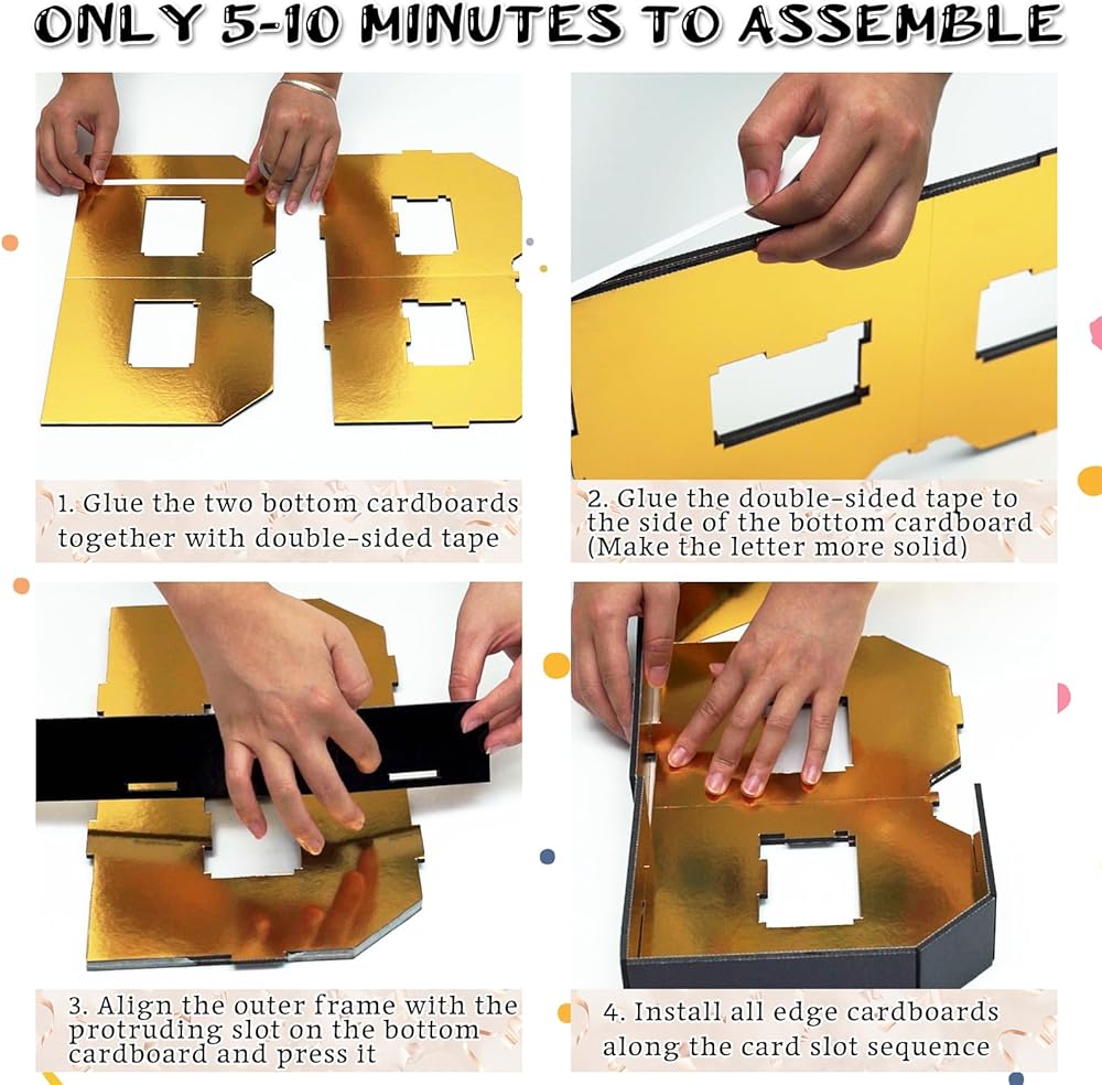 Easy Assembly: The pre-cut kits, equipped with double-sided tape, are ready for a quick setup. Reinforce by applying tape to the white letters cardboard and edges. Simply peel off the tape and fit the letters and edge plates into the card slots (just following the included instructions). You can finish assembling this beautiful charcuterie letters ONE box in under 10 minutes.