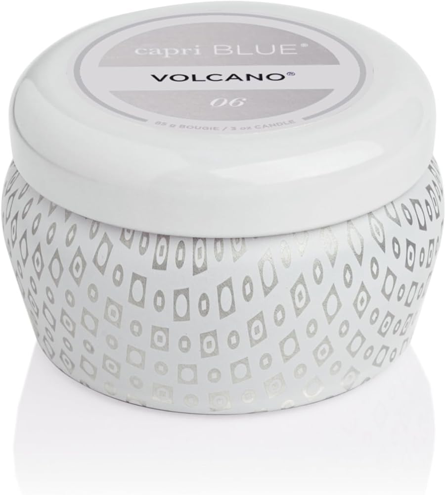 Capri Blue Volcano White Mini Tin Jar Candle (3 oz) - This mini Volcano candle is packed with fragrance and cuteness. The beautiful printed finish and Volcano fragrance will fit in any space, making these jar candles perfect to take with you on-the-go! Burn Time: Up to 15 hours.