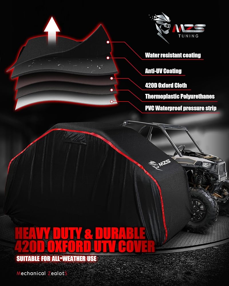PREMIUM 420D MATERIAL - MZS heavy duty utv cover is made of high-density 420D oxford fabric, combined with PU composite material to make the protective cover has more weather resistance, tear resistance and wear resistance