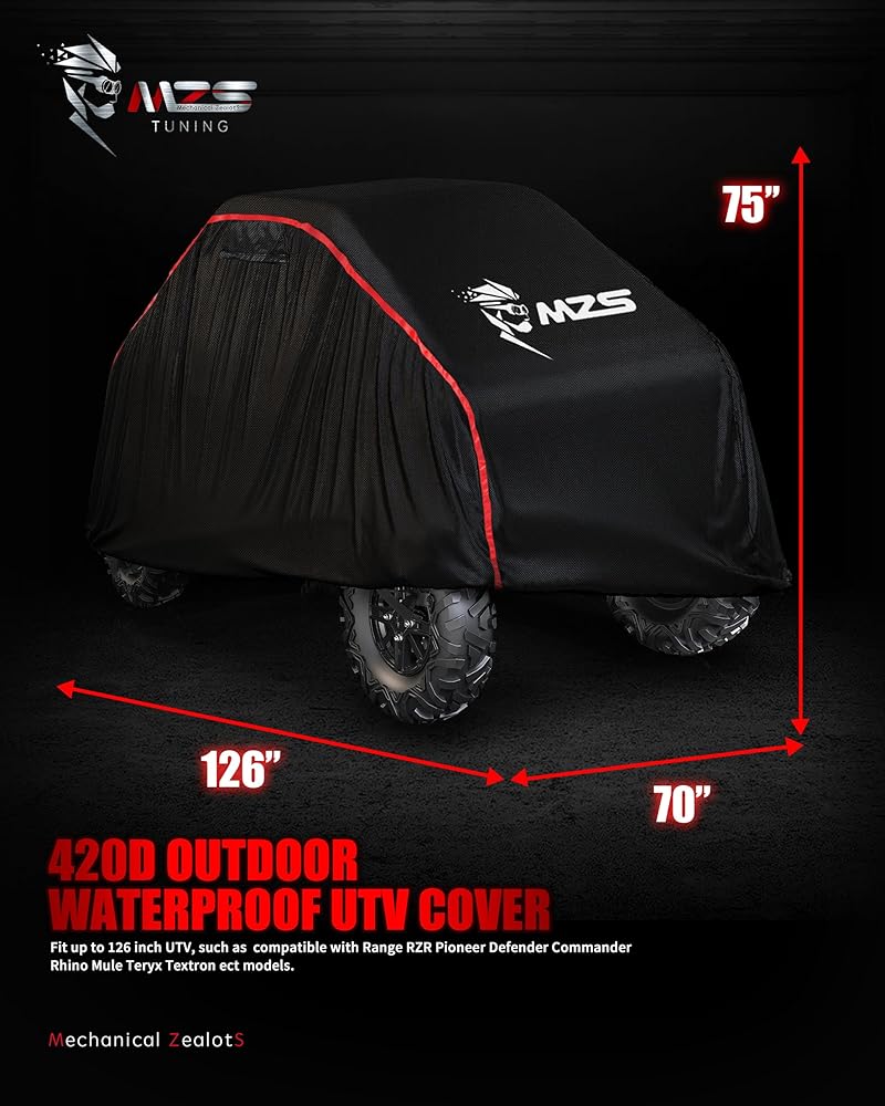MZS UTV Cover, Heavy Duty 420D Side by Side Cover Waterproof Outdoor Protection fits up to 126" Utility Vehicle 2 Seater Compatible with Range RZR Pioneer Defender Commander Rhino Mule Teryx Textron