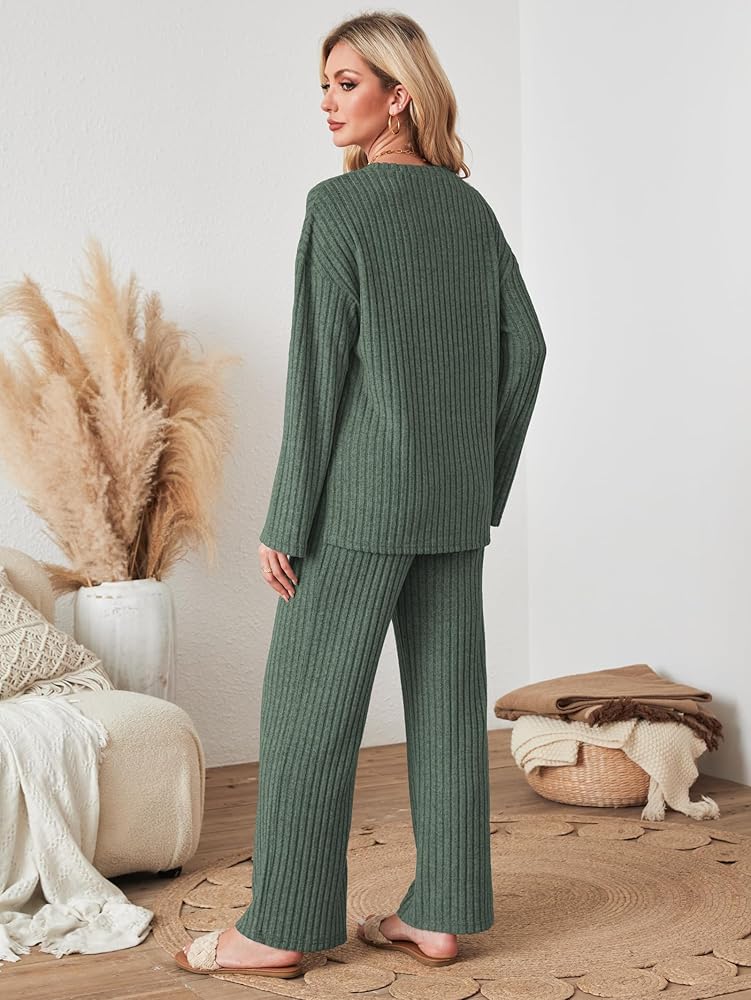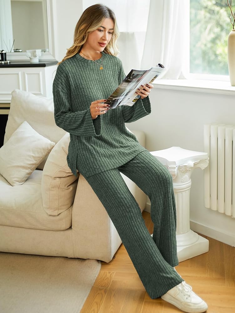 【Stylish Design】Solid color 2 piece lounge sets for women. Pullover Top -- long sleeve, crew neck, drop shoulder, side slit, loose fit knit; Pants -- knit wide leg pant for women, comfy features elastic waist band, relaxed relax fit. High elastic and roomy designs are forgiving for anybody, great for maternity postpartum belly too