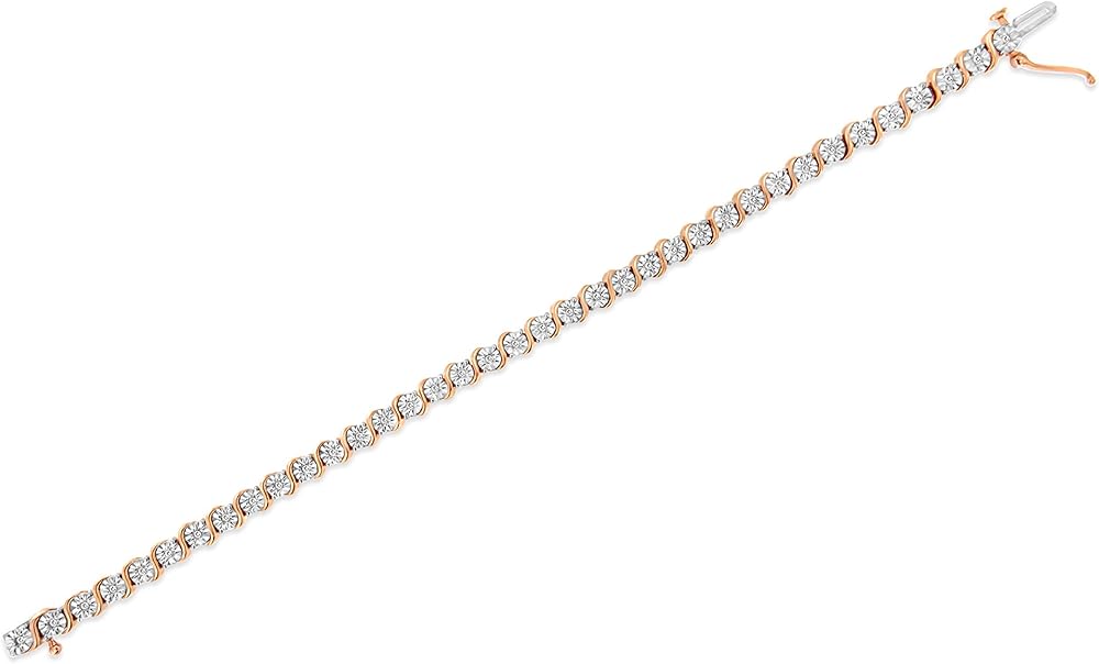 Elegant and timeless, this gorgeous 92.5% sterling silver tennis bracelet features 0.25 carat total weight of natural round brilliant cut white diamonds with 37 individual stones in all. The tennis bracelet has each diamond set into a faceted bezel style miracle plate setting sandwiched between faux bypass style waves of silver. The unique miracle-plate settings center each genuine diamond in a mirror-finish, high-polish frame, giving the illusion of a much larger stone. The 7” long bracelet culminates in a secure box with tongue and safety clasp. The bracelet comes in your choice of rhodium or 14 karat yellow or rose gold plated sterling silver. Whether worn for daytime glamour or evening sparkle, this classic tennis bracelet is gorgeously versatile. It's a timeless treasure she'll enjoy wearing every day.