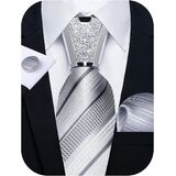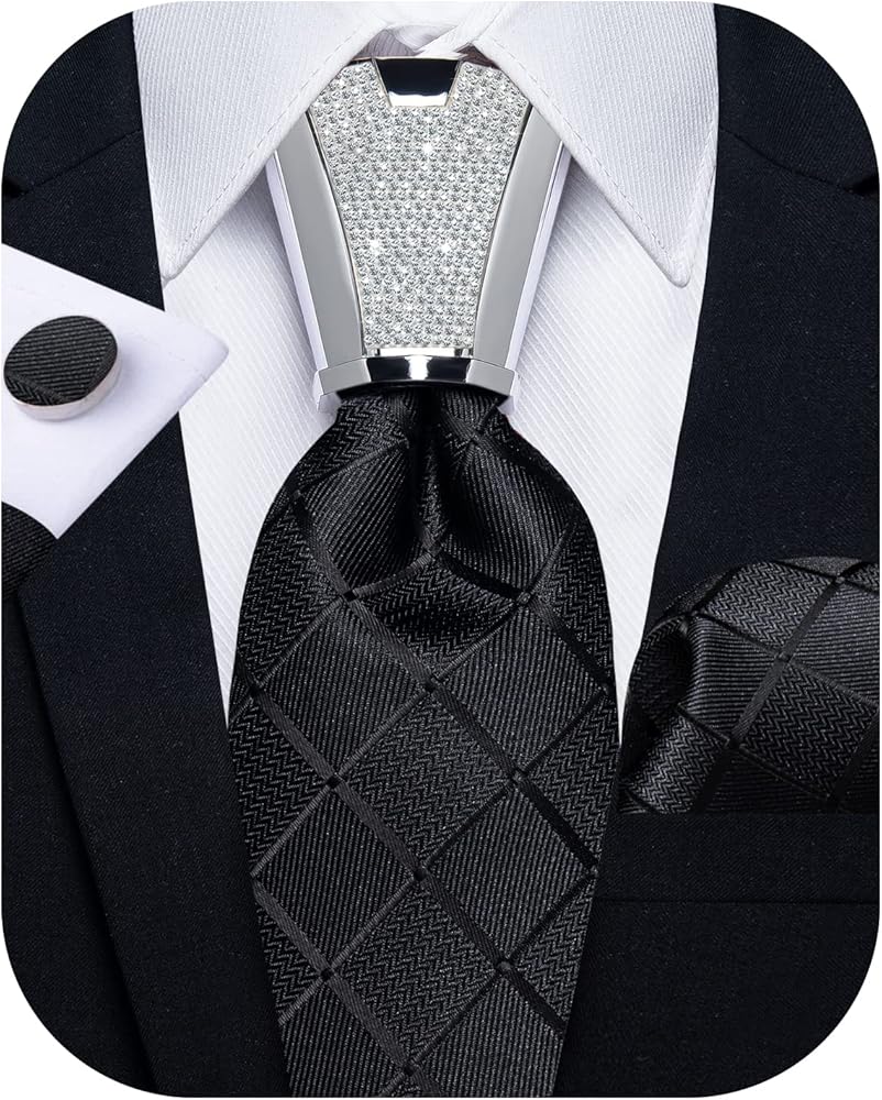 【Gift Set】1 Black Plaid Tie, 1 Pocket Square, 2 Cufflinks and 1 Silver Shiny Tie Accessories and 1 Silver Gift Box; DiBanGu silk tie and handkerchief set is a great gift for Father's Day, Valentine's Day, Thanksgiving Day, Christmas, Halloween