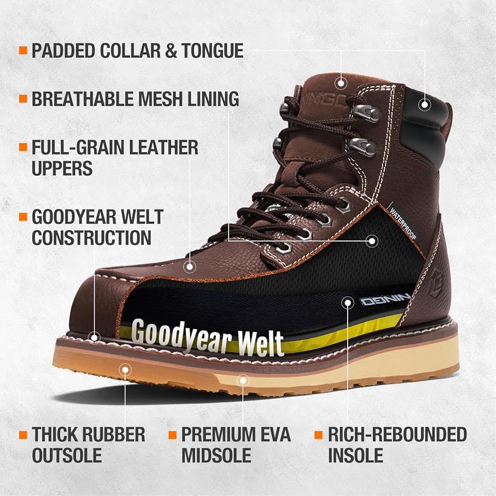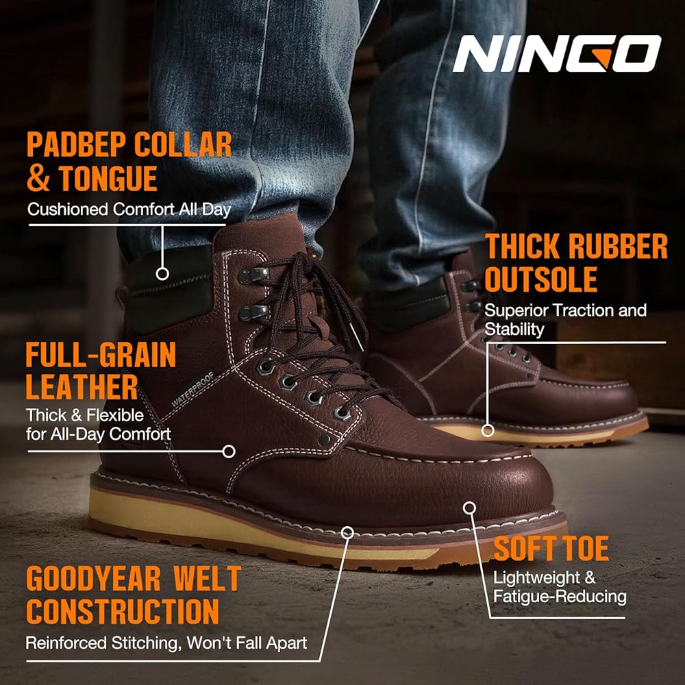 At NINGO, we understand the importance of combining comfort and durability in work boots. That's why we've crafted our Men's 6-Inch Moc-Toe Steel Toe Work Boots to provide the ultimate in protection and support for hardworking individuals like you. Our boots are built on the Extreme Durability Platform, ensuring maximum durability in challenging work environments. The traditional Goodyear Welt Construction method we employ ensures that these boots are solid, water-resistant, and built to last. Crafted with premium waterproof full-grain leather uppers and featuring oil & slip-resistant rubber lug outsoles, our boots provide secure footing in slippery conditions and deliver exceptional abrasion resistance for your work needs. But protection is not our only priority - we also prioritize comfort. Our Unique Footbed System, combined with the gel-padded insole, is designed to minimize fatigue and provide all-day comfort. The padded collar and tongue add extra cushioning, while the innovative ankle support design ensures stability throughout the day. These moc-toe steel toe work boots are perfect for a variety of work settings, including construction sites, factories, warehouses, and industrial environments where hazards are common. They are also suitable for outdoor activities like hiking, camping, and hunting, making them versatile enough for any situation. At NINGO, we take pride in our commitment to quality and customer satisfaction. That's why our boots come with a One-year Quality Assurance guarantee, giving you peace of mind with every purchase. Choose NINGO Men's 6-Inch Moc-Toe Steel Toe Work Boots for the comfort, durability, and protection you need to tackle any job with confidence.