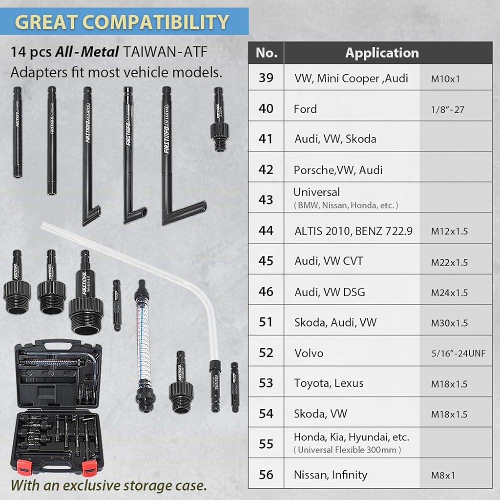 【 UNIVERSAL COMPATIBILITY 】 The ATF filler set comes with Taiwan Patented ATF adapters-22 pieces; extra oil funnel and for BENZ 725.0 9-Speed accessories are available in our store for various vehicles' fluid extraction and transfer. EXTRA Universal Tube to refill the new transmission fluid for those models with ATF dipstick.