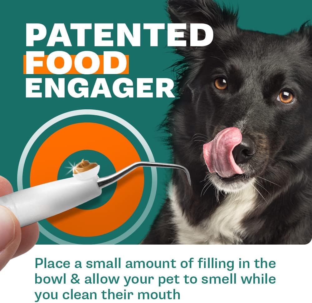 EASY-TO-USE FOOD ENGAGER SYSTEM - Our one-of-a-kind food engager system is designed to provide proper cooperation while you clean your pet's teeth. Simply place a small amount of filling of your choice in the food engager bowl and allow your pet to smell it while you gently scrape and remove tartar effortlessly with our tartar scraper and dental picks tools. Then, brush your pet's teeth and gums with the cat and dog tooth brush provided.
