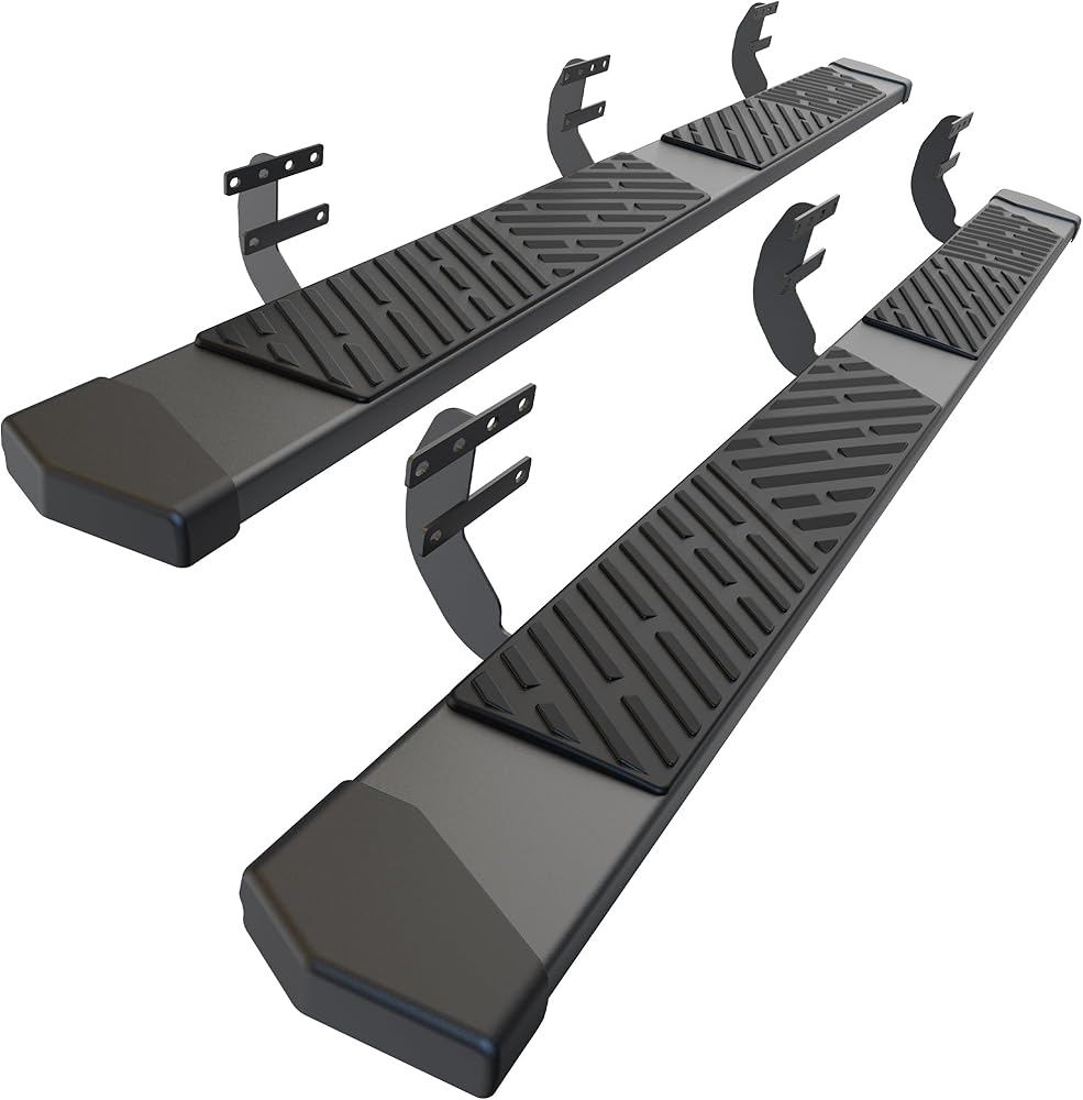 MATERIAL: Made of heavy-duty carbon steel molded into stylish triangular tube structure. Dual stage E-coating powder textured black finish bolsters these side steps withstand various weather conditions and everyday wear and tear, ensuring long-lasting performance.