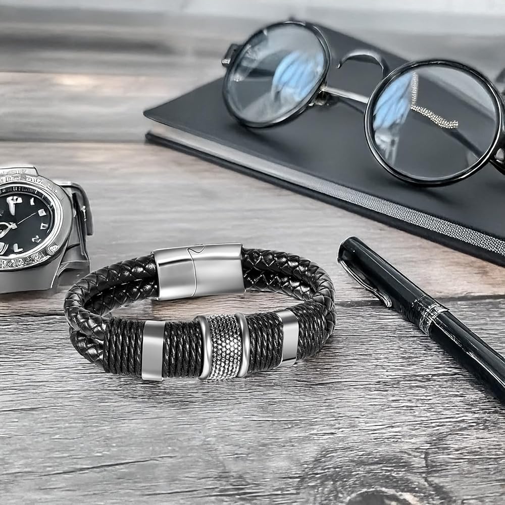Enjoy Risingsun mens leather black bracelet for men is made of natural premium leather, as well as Antioxidant high-strength, and fine polishing alloy. This bracelet is sleek and modern. For boyfriends, husbands, fathers, and sons, this piece of mens jewelry is a perfect gift that holds our love for them, make a loved one stand out. Enjoy Risingsun specializes in making high leather braided bracelets, pulsera de cuero para hombre, leather wrist band men, pulsera para hombre, if you have any questions or suggestions, please contact us anytime!