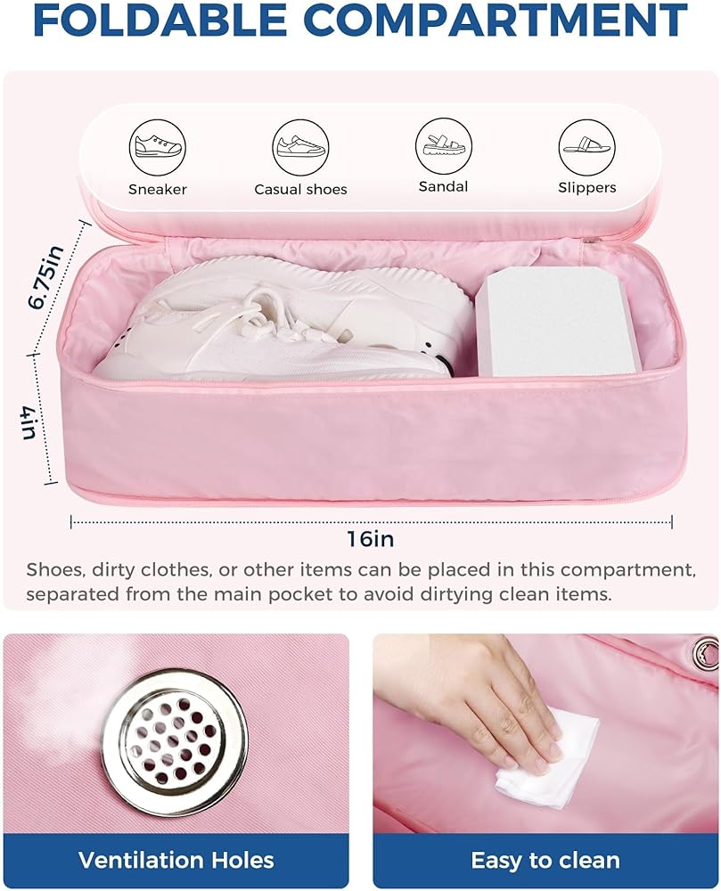 Expandable Shoe Compartment with Vents - Keep your clean clothes separate from sweaty shoes with the dedicated shoe compartment. Breathable vents ensure freshness, while the expandable design offers added flexibility. Perfect for workouts, weekend trips, or sports, keeping you odor-free and organized