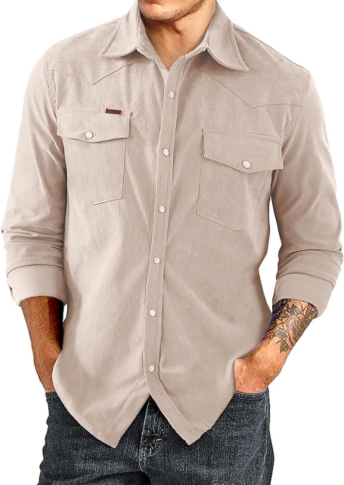【Classic Comfort】Our mens corduroy jacket features a relaxing fit for the utmost comfort. Elements like solid color, lapel design, vertical striped texture, and 2 chest flap pockets join to introduce a men's corduroy button down that redefines elegance. Easy to roll-up button cuffs and a straight hem provide ideal untucked wear.