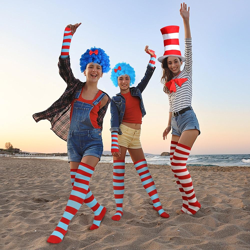 Costume Set: You will recieve the package includes 2 blue wigs, 1 hat with bow accessories, 2 pairs of red and blue stockings, 2 pairs of red and blue sleeves, 1 pair of red and white stockings. From head to toe, and you don't have to spend time picking.