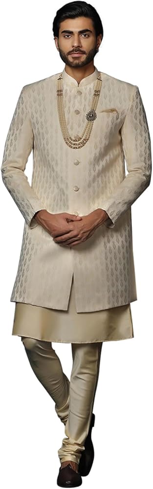 Fit: Regular fit, designed for comfort while maintaining a sharp silhouette. Available size S(38), M(40), L(42), XL(44). Please see the size chart in description or image section before ordering, Bottom Wear: Paired with a matching off-white churidar with adjustable drawstring closure, complementing the sherwani perfectly.