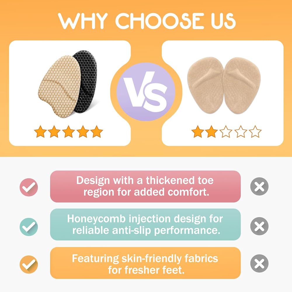 【Non-slip and Secure】ZAIWOO forefoot pads boast excellent adhesiveness, ensuring they stay firmly in place inside your shoes without slipping. Whether you're walking quickly or standing for extended periods, these pads will remain in position, preventing your feet from sliding forward and providing continuous support and protection.