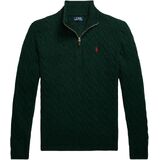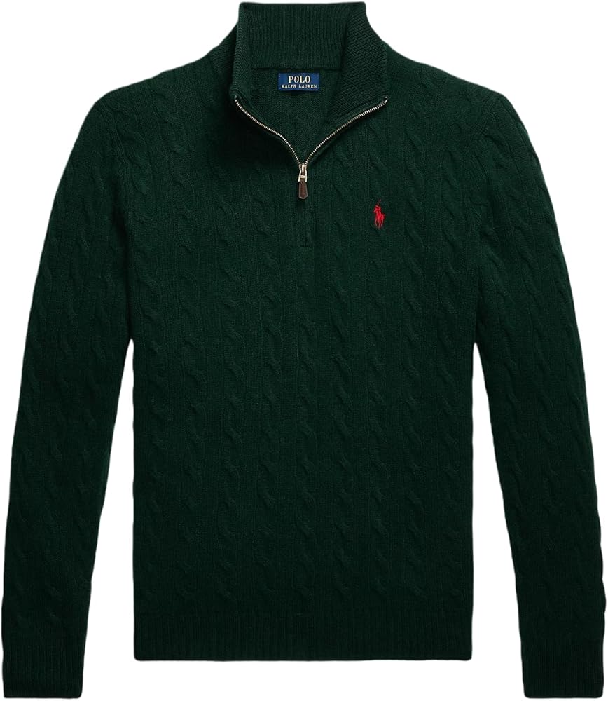 Rib-knit mockneck. Quarter-zip placket with a suede zipper pull.