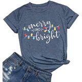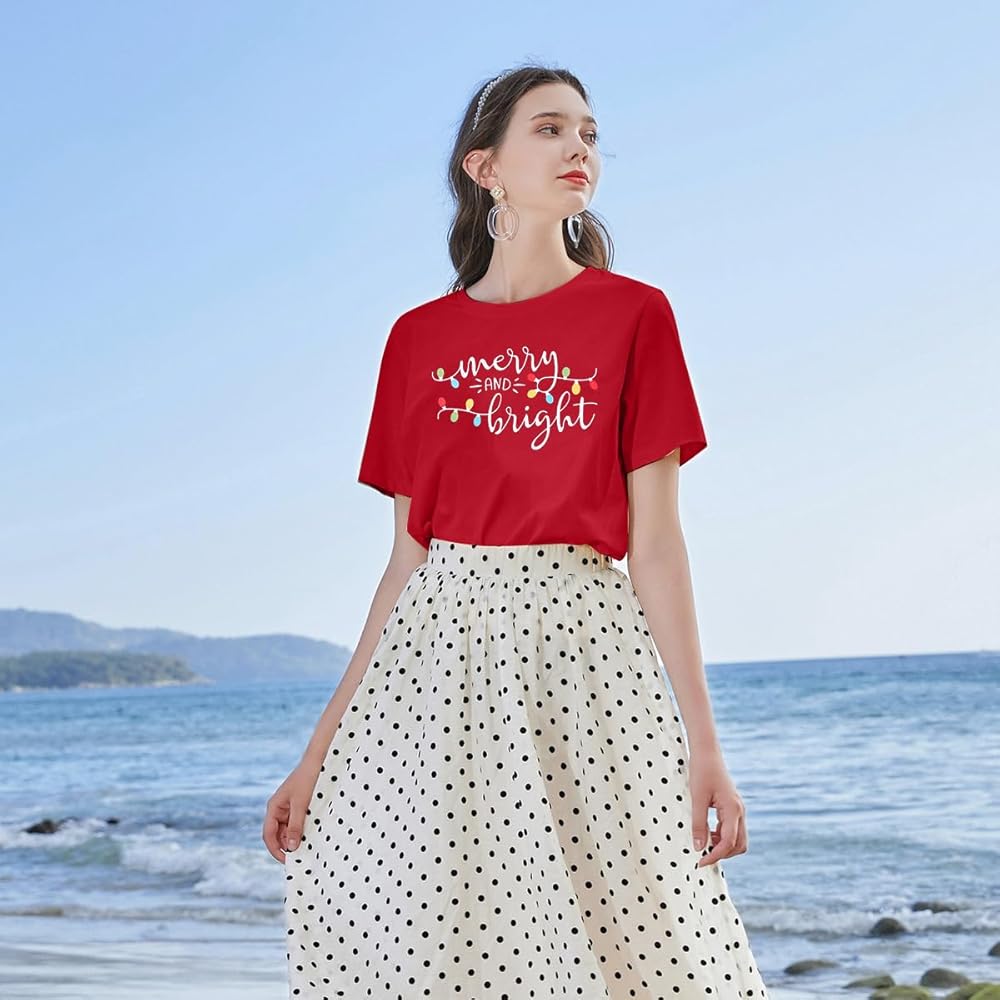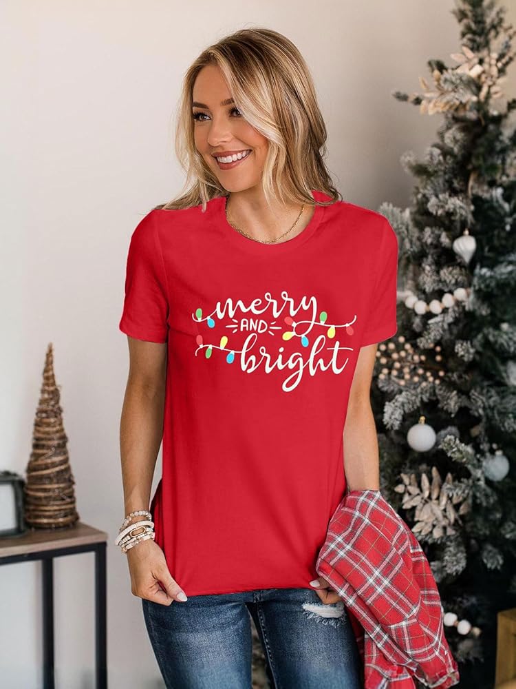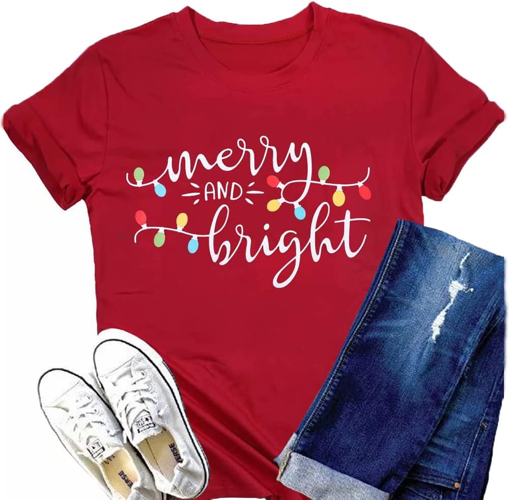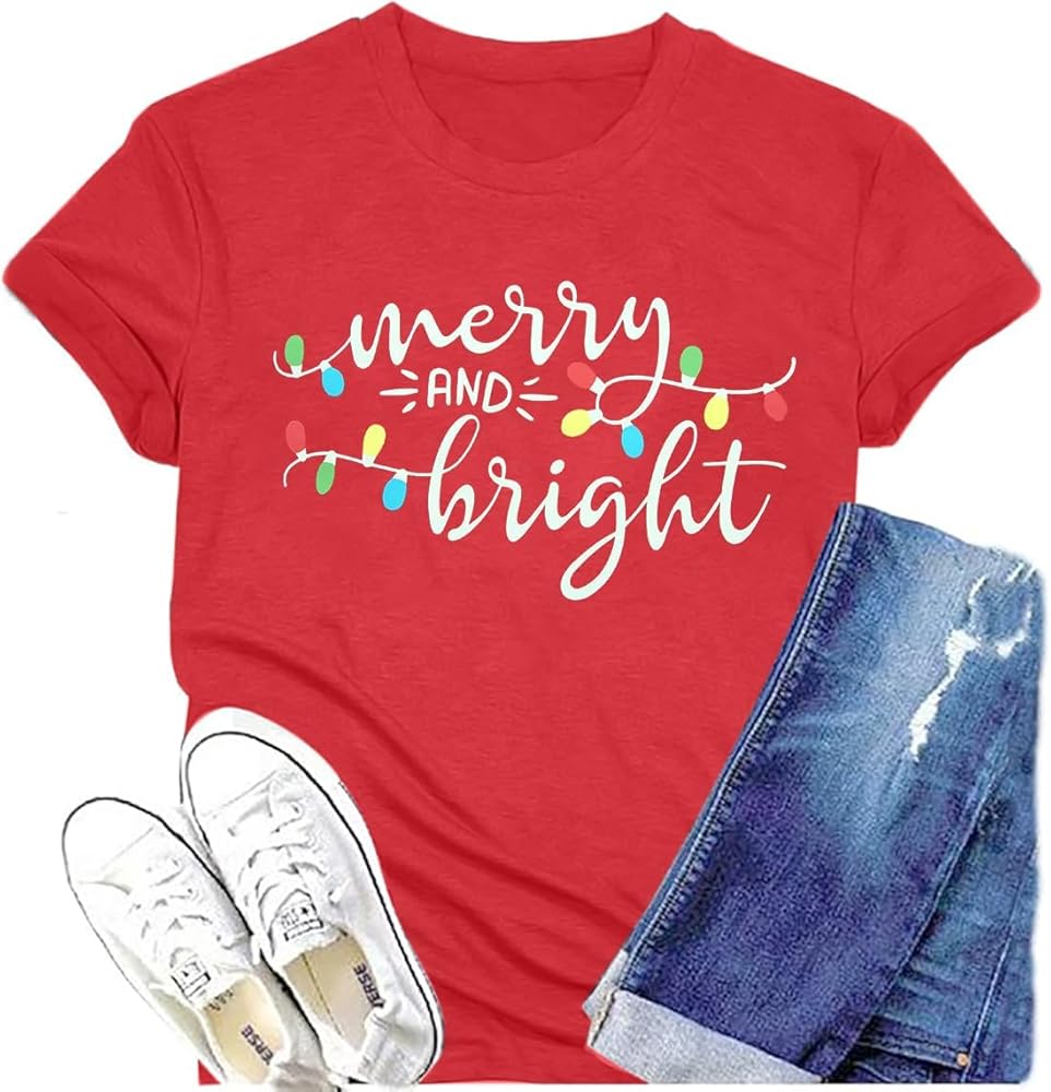 Design: Merry and Bright Tshirt, Merry Christmas Shirt, Christmas Xmas Gift Shirt Tops, Funny Letters Printed Tees, Short Sleeve T-Shirt, Color Block Tops, Round Neck Shirt, Loose Casual Fall Winter Shirt.