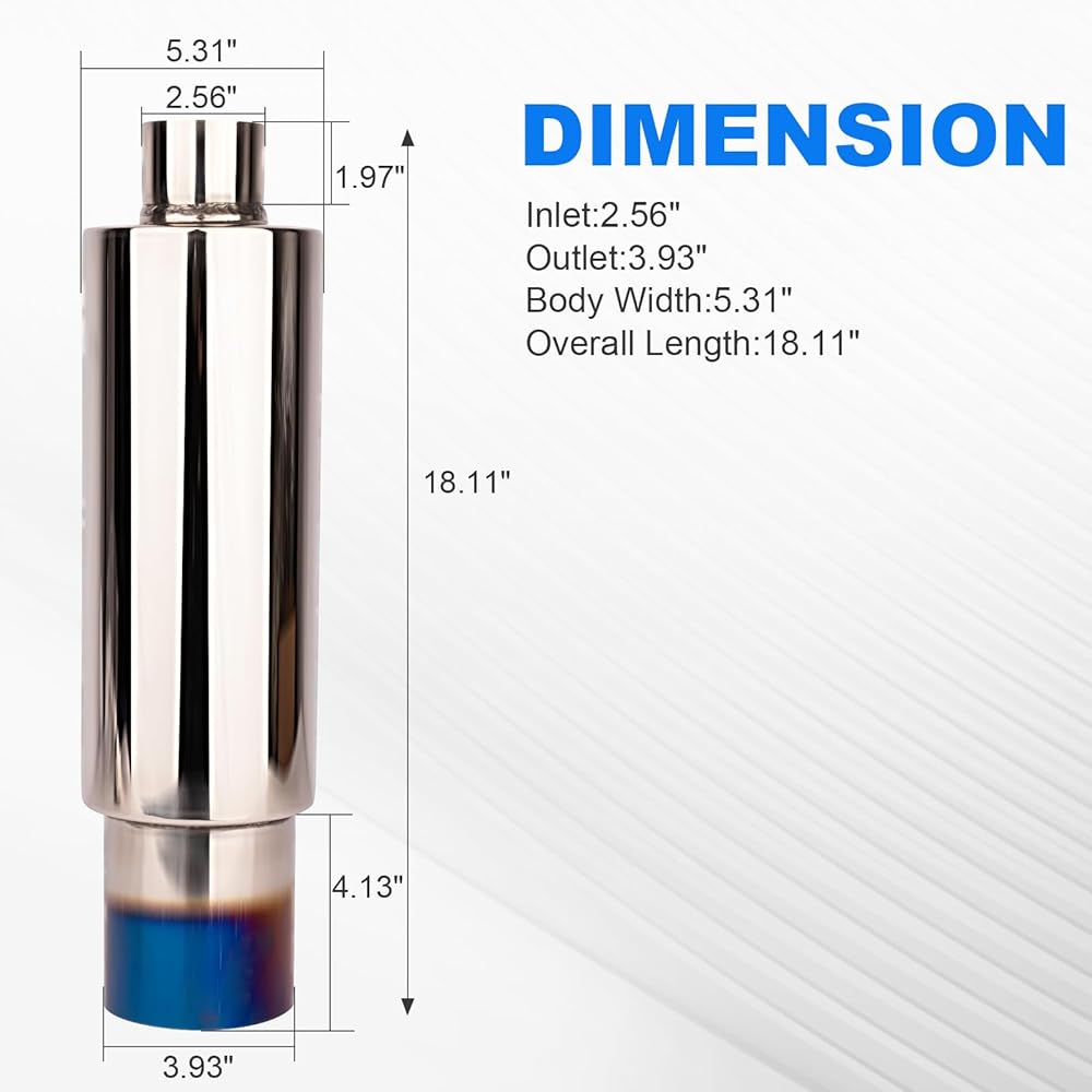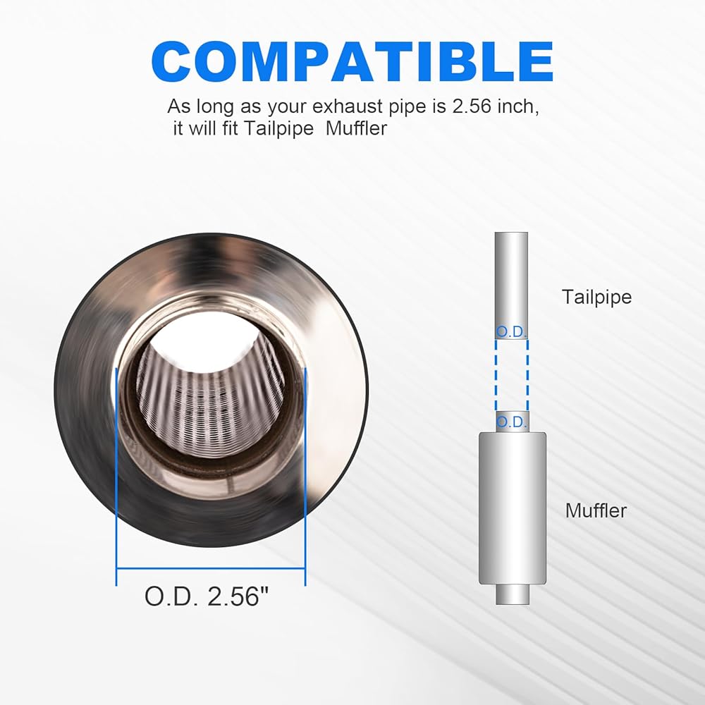 FIT: 2.0 inch inlet universal exhaust muffler, universal fit for all 2.0 inch exhaust pipe. Muffler and exhaust pipe are considered matched as long as they can be welded together seamlessly.