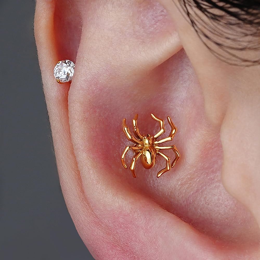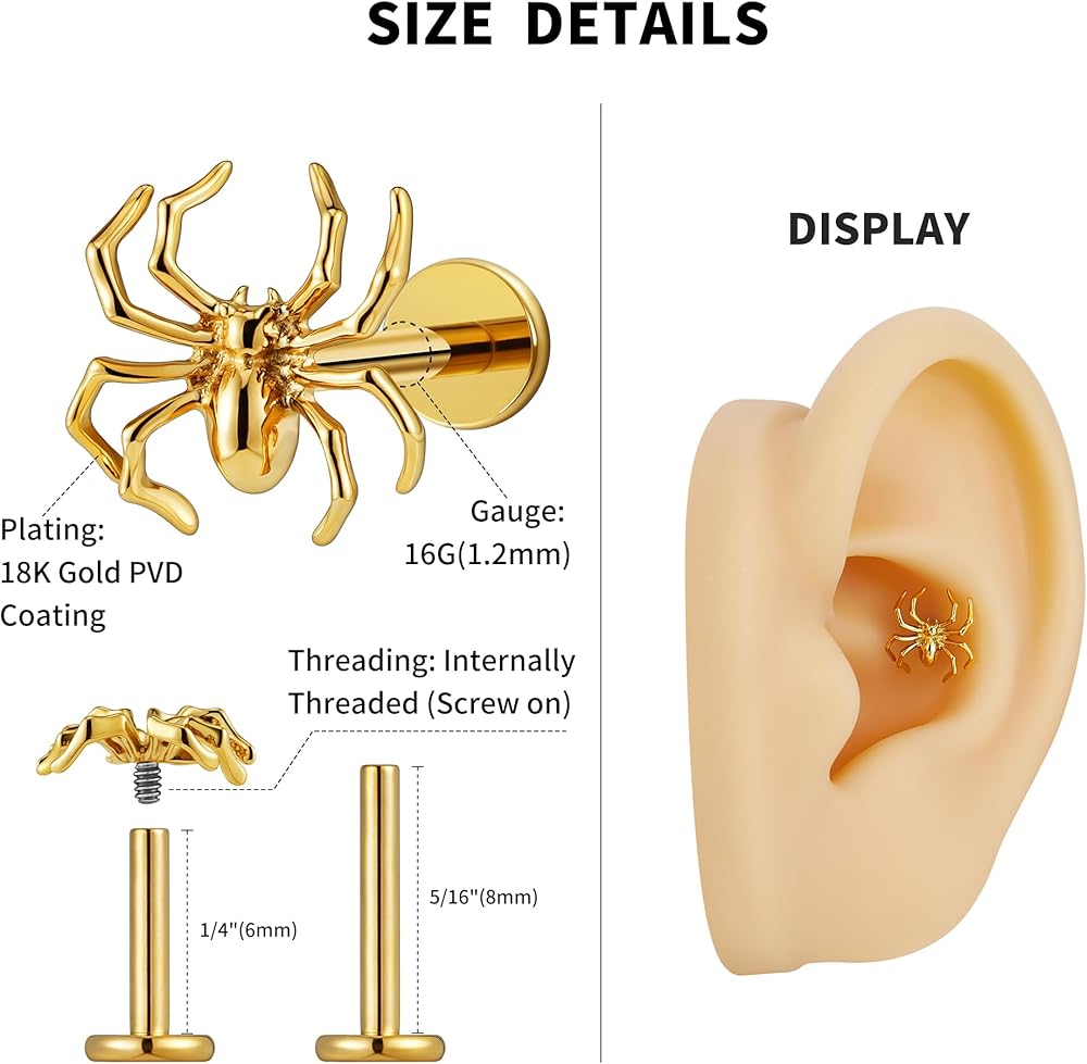 1. [ 1PC Piercing Stud ]: Sold as a Single Piece, each item package includes Spider Stud top × 1, 6mm post × 1, 8mm post × 1, Finger Cot × 2, and Store Box × 1.