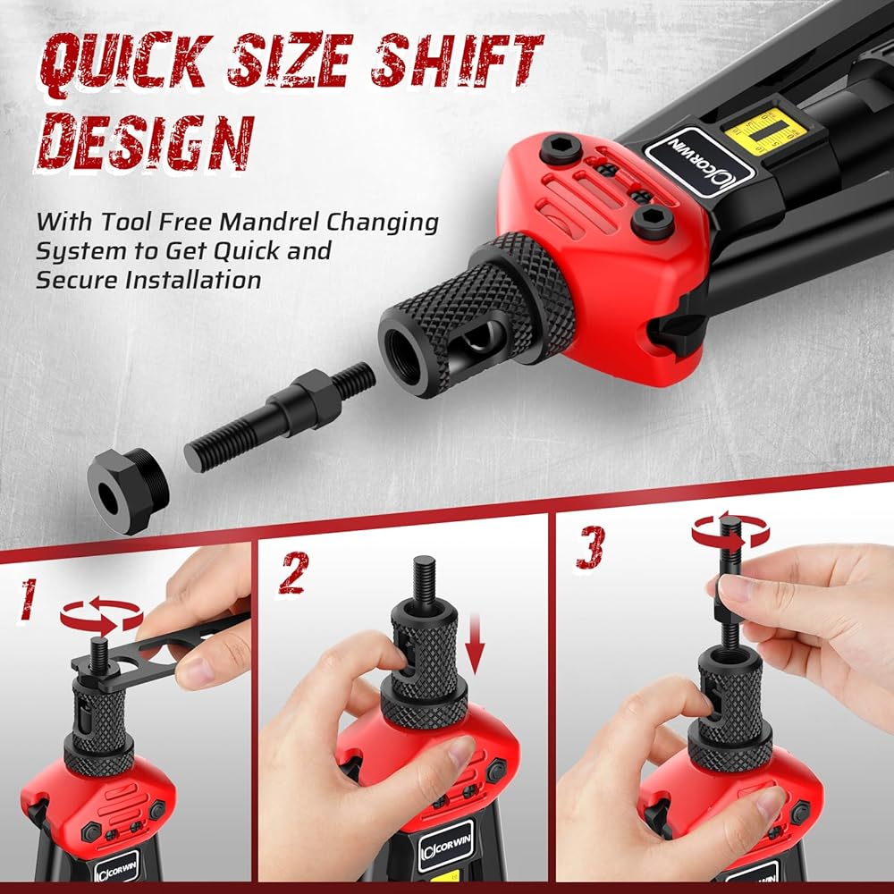 What you will get: You will receive 1 16-inch CORWIN rivet nut gun, 9 pairs of extra-long size mandrels and nosepieces stored in a colored box, 1 wrench, 1 rugged carrying case. We also provide worry-free service and consultation.