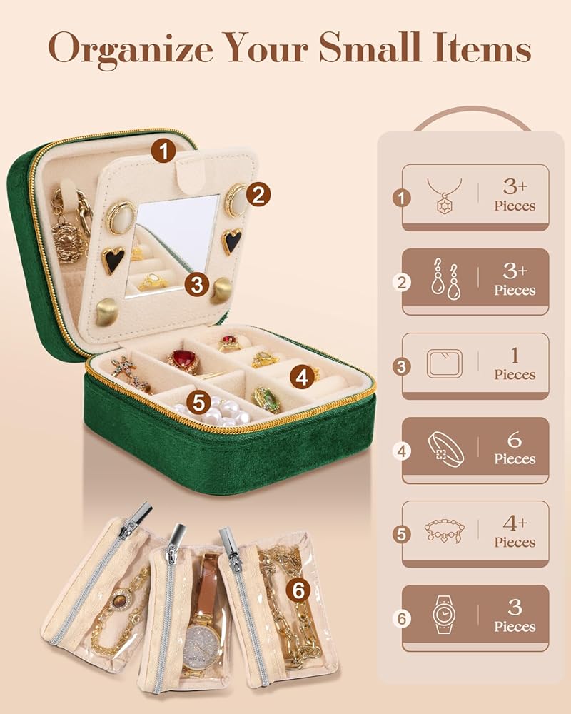 Compact Size: At 4×4×2 inches, this travel jewelry case is the epitome of portability. It fits easily into your luggage or handbag without taking up much space. This jewelry organizer is designed to keep your precious accessories organized and safe during your adventures.