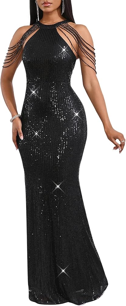 【Design】: Elegant Sequin Glitter V neck design with Tassel is suitable for women, making you more sexy and charming. Figure-Fitting shape, floor-Length make you look sexy and elegance. Cocktail Mermaid Gown maxi Dress, make you more beautiful, fashion.