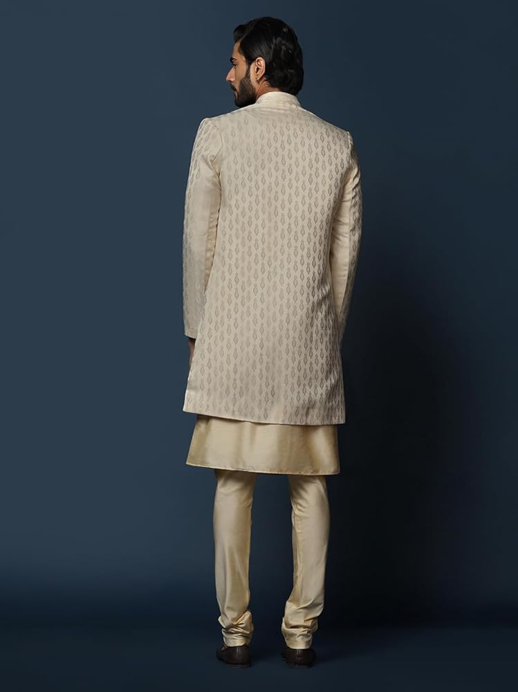 Pattern: Delicate embroidery with ethnic motifs in a jacquard design, adding texture and visual appeal to the sherwani, Fabric: High-quality silk blend, providing a luxurious sheen and soft feel for comfortable, all-day wear.