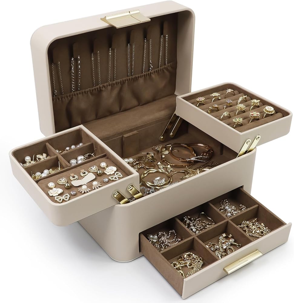 Exquisite Design: The 3-layer jewelry case offers ample space for your exquisite jewelry collection. This newly upgraded girls' jewelry organizer features functional partitions that make the most of every available space, storing your rings, bracelets, cuffs, earrings, studs, brooches, watches, and other souvenirs. Say goodbye to lost jewelry and enjoy a display that is orderly, neat, and beautiful, showcasing all types of jewelry.