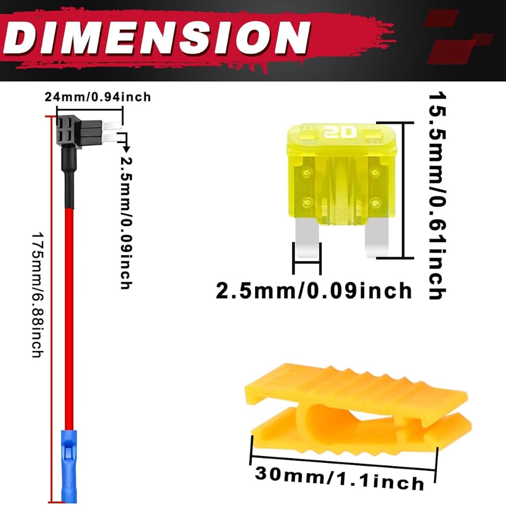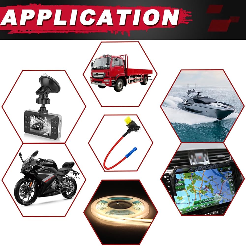 【Wide Application】Mini Fuse Taps for Cars, Trucks, SUV, ATV, UTV, Campers, RVs, Motorcycles, Boats, snowmobiles GPS,etc. Also applicable to LED strips,USB charger, dash cams or other electronic devices that require direct wiring into the fuse box.