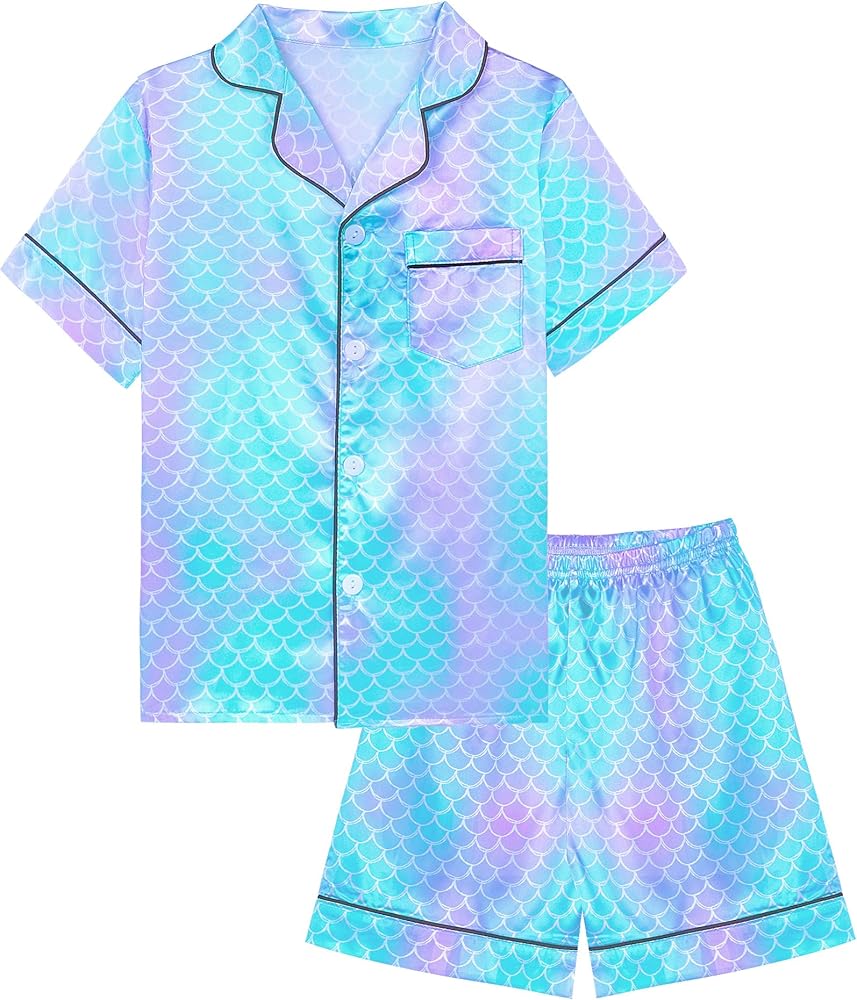 2. Girls Satin Pajamas Set: Short sleeve notch collar button-down top match elastic waist pants. Simple design with chest pocket. This 2-piece pajama set is the perfect jammies for kids girls.