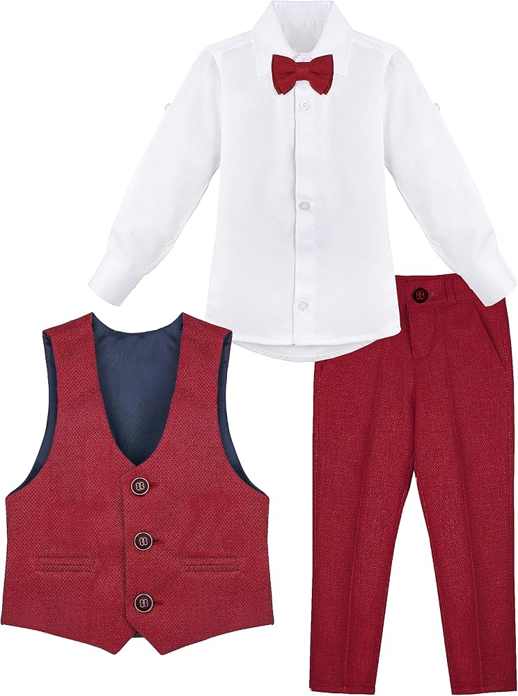 Classic Vest Suit – These suits for boys come with everything they'll need to look smooth and stylish at parties or events including a formal lined vest, pressed pants, collared white dress shirt, and matching bowtie.