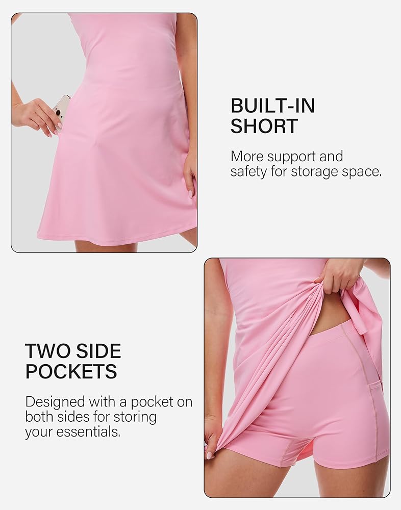 Four functional pockets: Our golf dress offers the ultimate in convenience. The 2 shorts pockets keep tennis balls and mobile phones safe and secure, while the 2 side seam pockets on the dress cleverly store tees, scorecards or keys, ensuring essentials are within reach during your game.