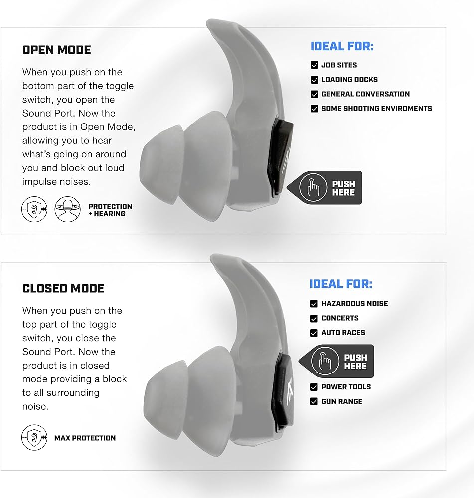 OPEN MODE CONTROL: Switch effortlessly between full hearing protection and hear-through mode using the simple toggle switch. Stay connected to your surroundings or enjoy total silence when needed.