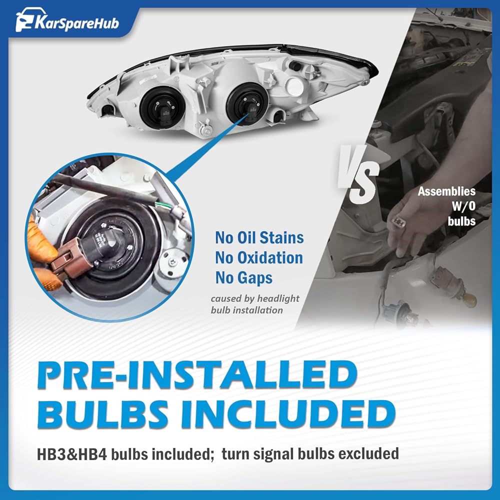 **OEM-Quality Assurance**: OE number:81550-AA060/81510-AA060.Part Number: TO2502137/TO2503137.Meticulously tested for 100% compatibility, precisely modeled to fit your original car model: Compatible with 2002-2004 Toyota Camry Headlamp Replacement.Bulbs Included.