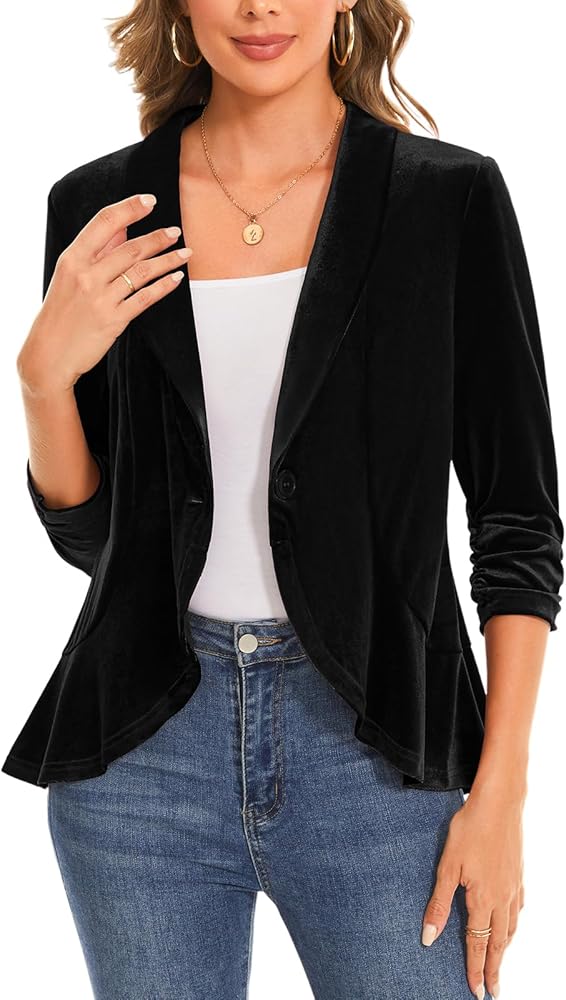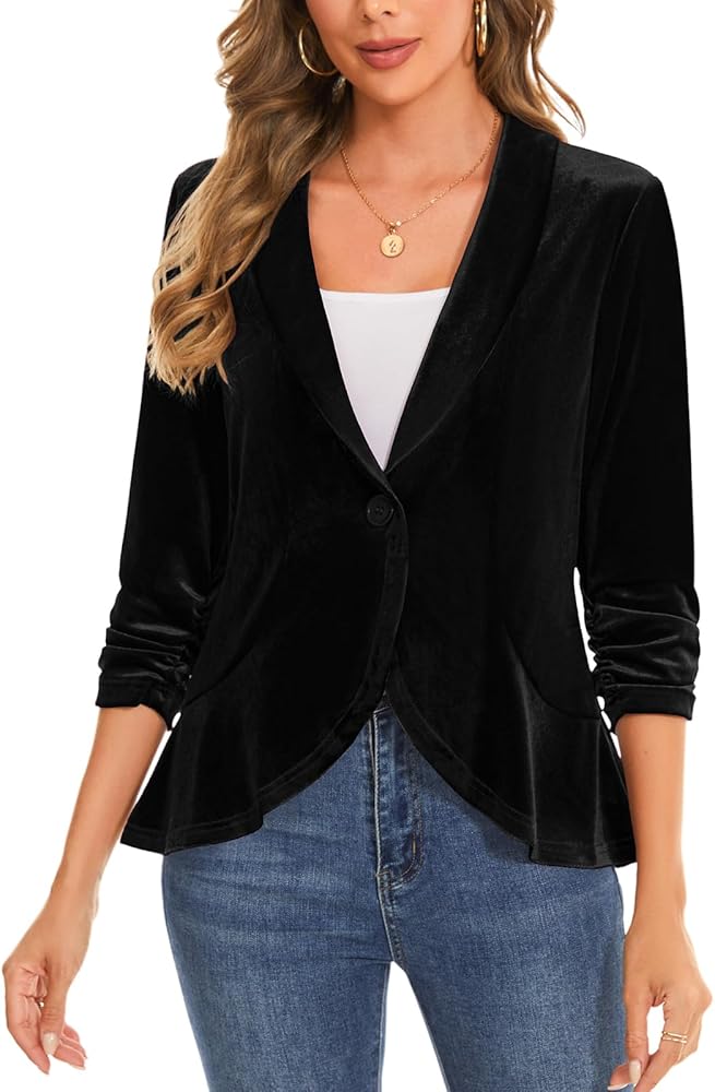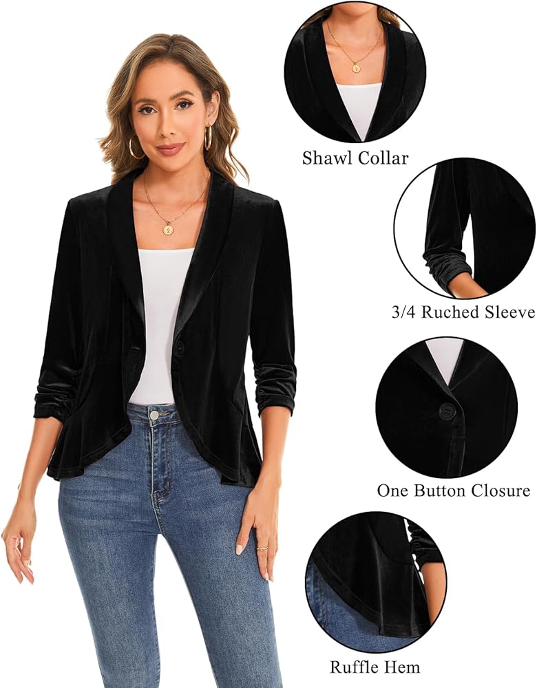 【Feature】 Ruched 3/4 Sleeve velvet blazer, Button Front tailored velvet coat, Shawl lapels collar, Work office velvet jacket suit, Solid color, Velvet suit jacket cardigan for women work casual.