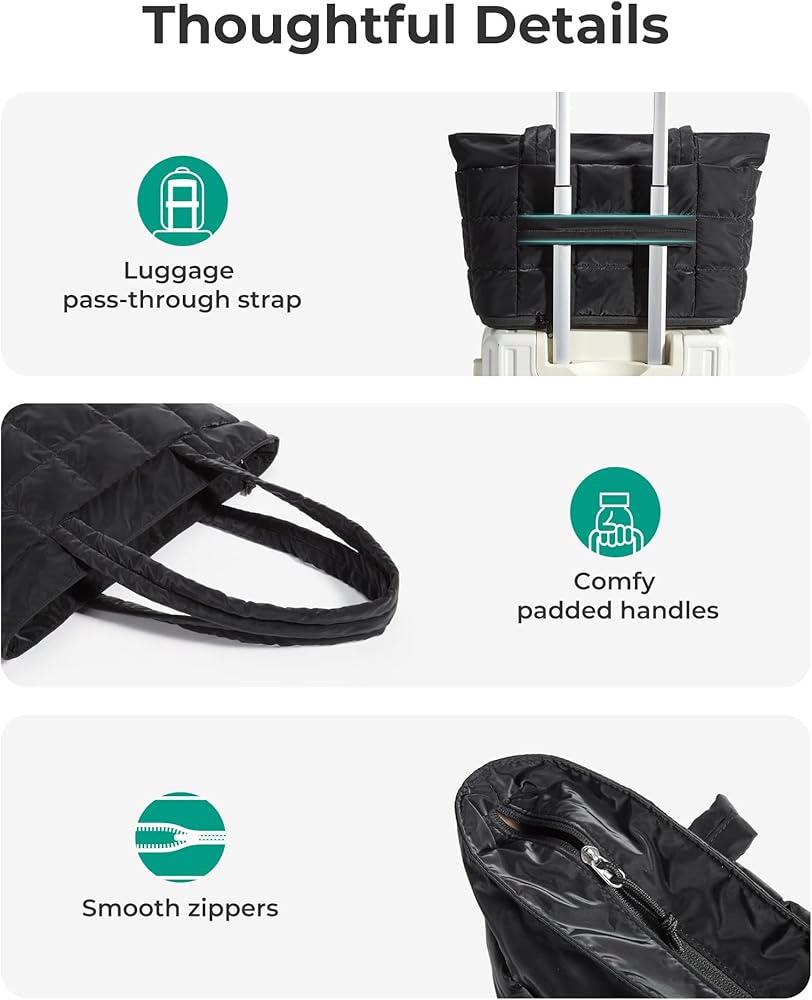 Versatile Tote Bag: A regular handle and a pass-through luggage strap of our puffer tote bag allows you tote it or across the luggage according to your need, perfect for sports, weekend trips, gym, travel, business and overnight bag