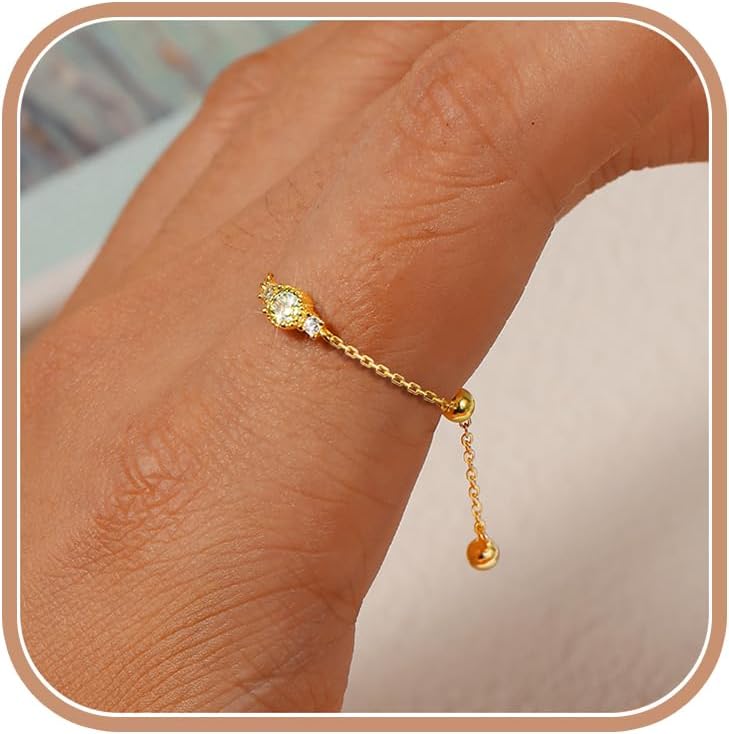 CZ Link Chain Ring for Women, 925 Sterling Silver Adjustable Band Birthstone Stacking Tassel Dangling Statement Rings with Dangle Beaded Ball Dainty Promise Chain Ring Birthday Wedding Jewelry Holiday Gifts