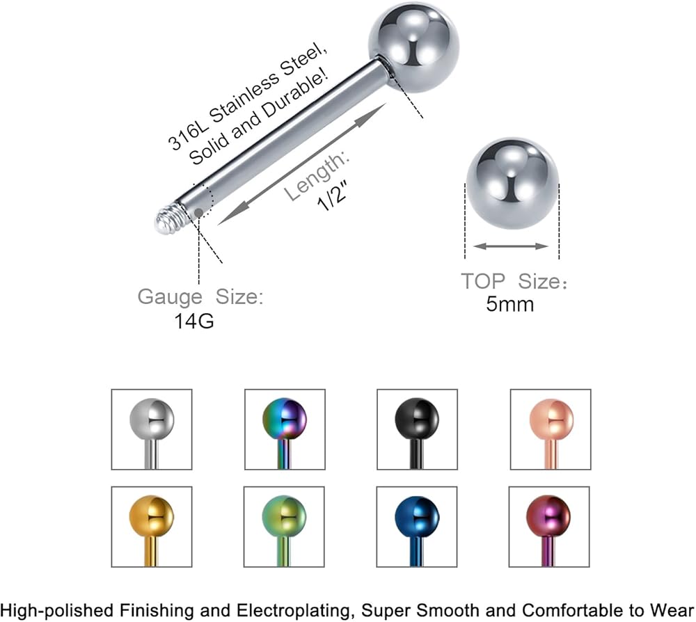- Barbell Size: 14 Gauge(1.6mm), Ball Size:5mm, Bar Length: 1/2" (12mm)