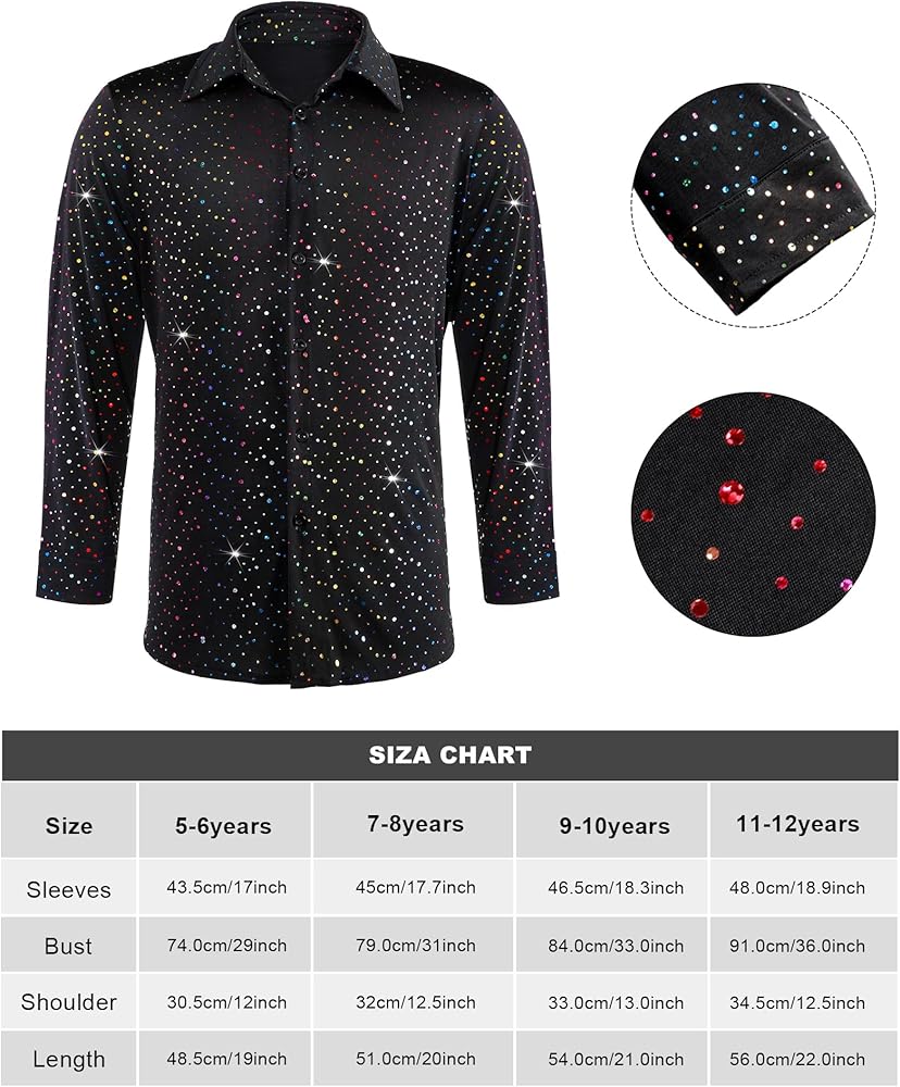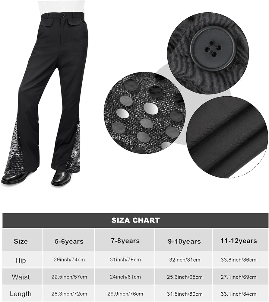 Size Information: the size of the shirt and pants have 5-6years, 7-8years, 9-10years, 11-12years, please make sure about the size information before purchase, suitable for most people and occasions; Whether you're going to a themed party, cosplay event, or just want to spice up your wardrobe for fun, the 70's disco outfits for kid is a good choice