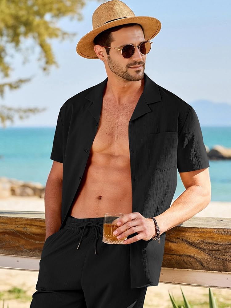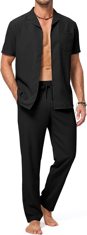 Practical & Casual Design -- The short-sleeve button-down shirt features a camp collar, chest pocket, and untucked design, perfect for completing your vacation look. The soft beach pants are equipped with an elastic drawstring waist, two front pockets, and open bottoms, offering ample waist and leg room for unrestricted movement.