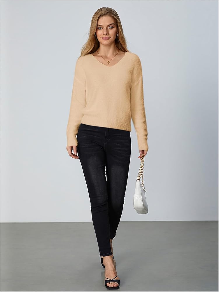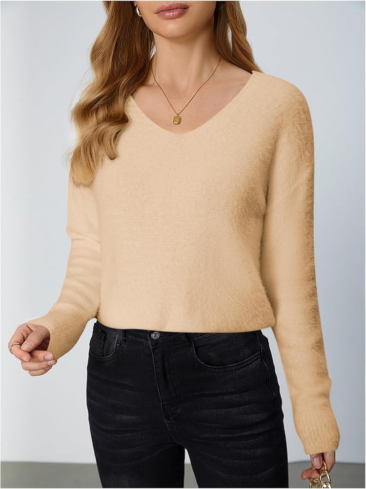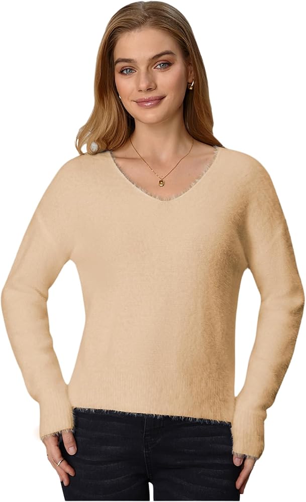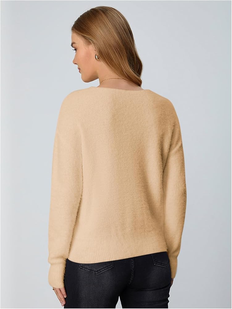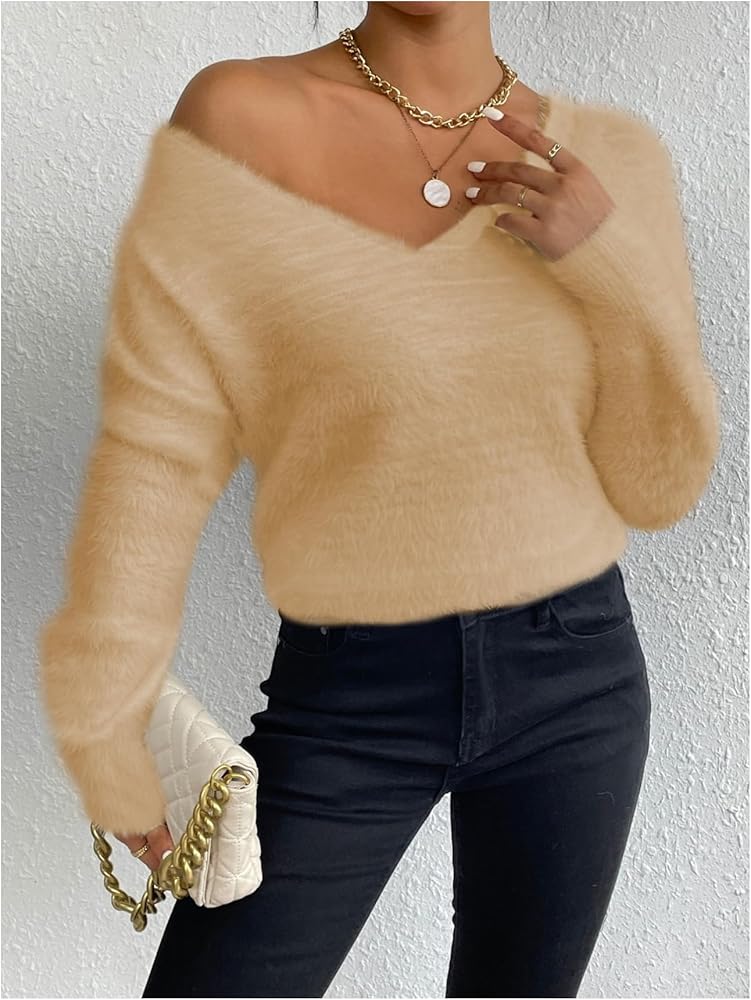 Verdusa Women's Fuzzy Cozy Sweaters V Neck Off The Shoulder Long Sleeve Pullover Fall Sweater