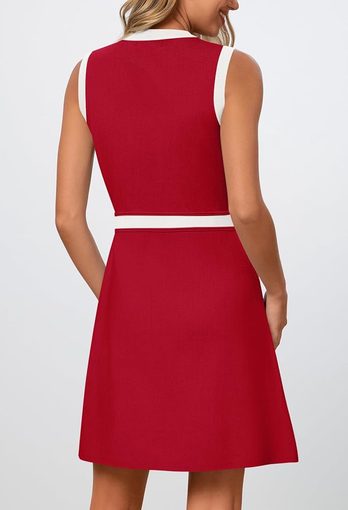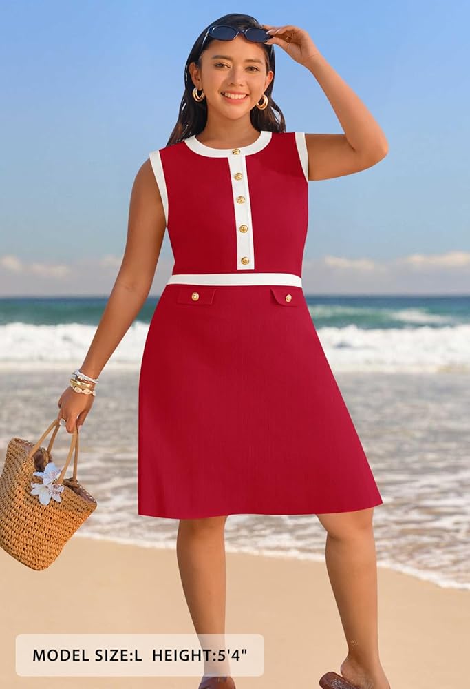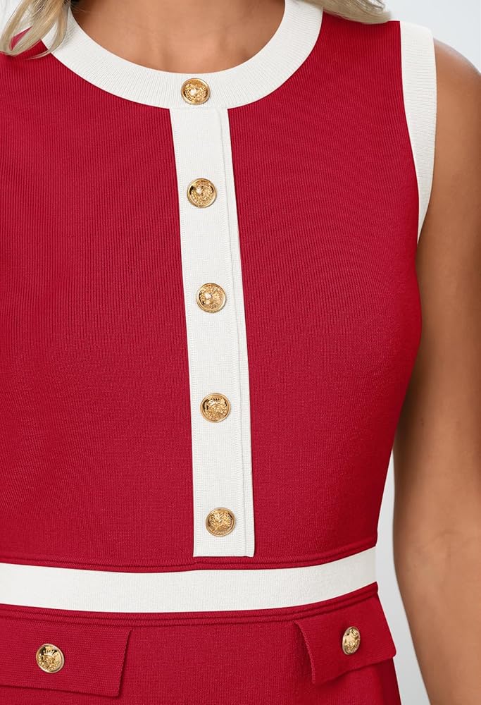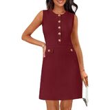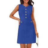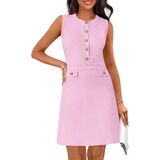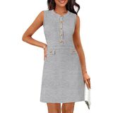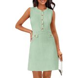 Feature: Sleeveless, crew neck, decorative buttons, high waist, two non-functional faux front pockets, mini length, loose a line hem, a bit of bodycon , slim fit, an elegant formal dress for women, casual work dresses for women 2025