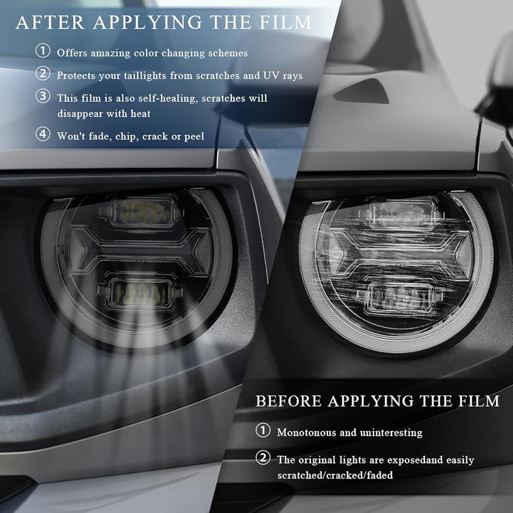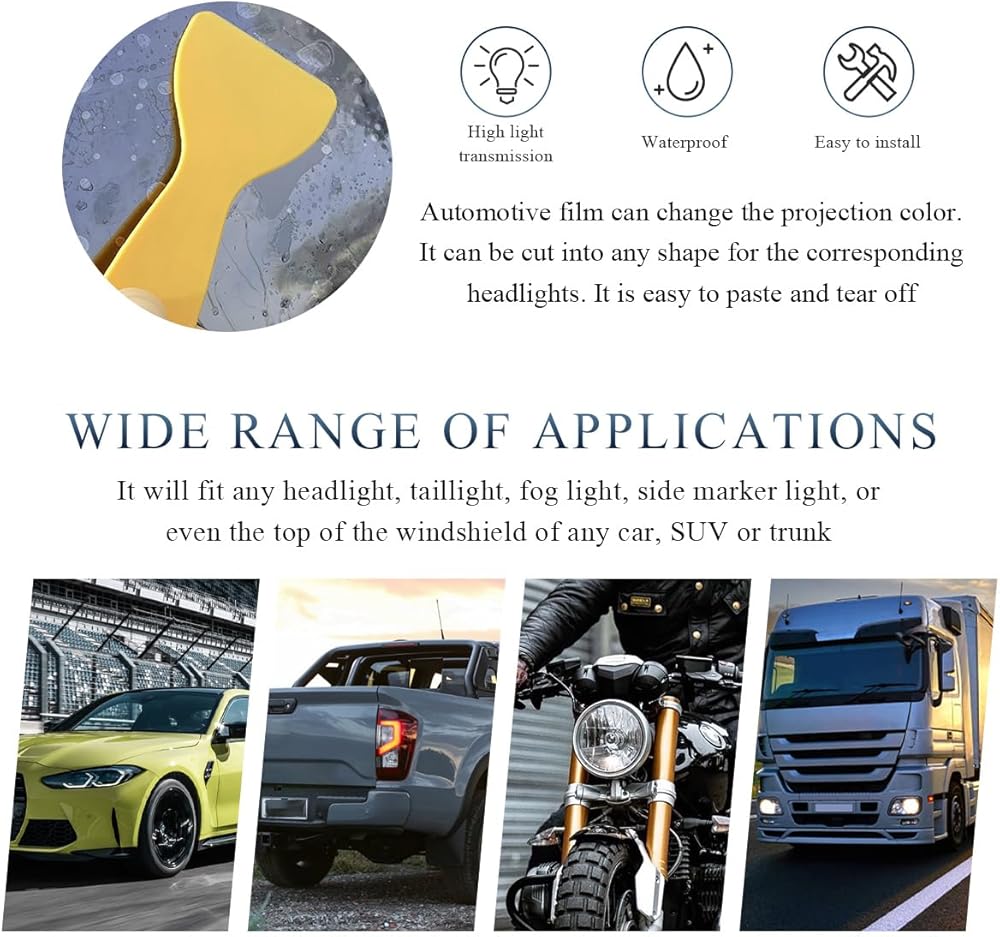 【Multiple Purposes】: This film allows you to change the projection color of your lights according to your needs. Additionally, it can efficiently shield your lights from scratches, chips and minor impacts, thereby preserving the clarity and functionality of your car lights.