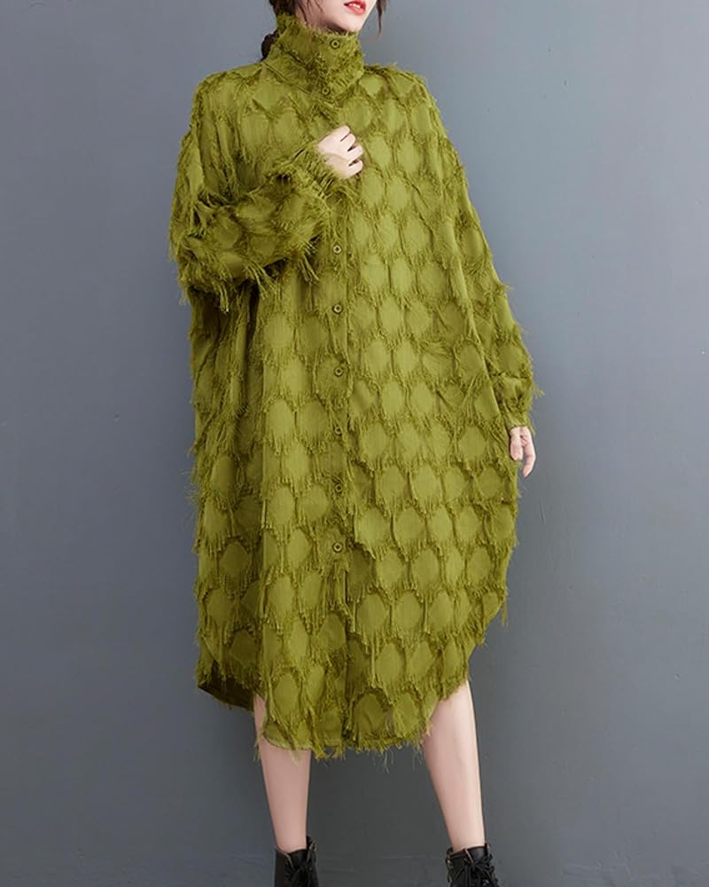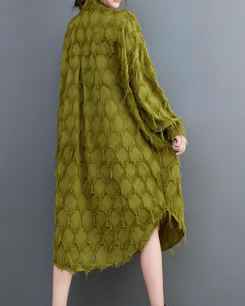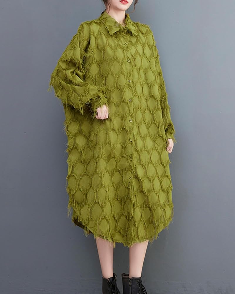 【Design】: This oversized dress features solid color, simple lapel design, with buttoned cuffs for easy wear and a chic printed hem that exudes sophistication.