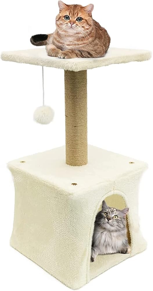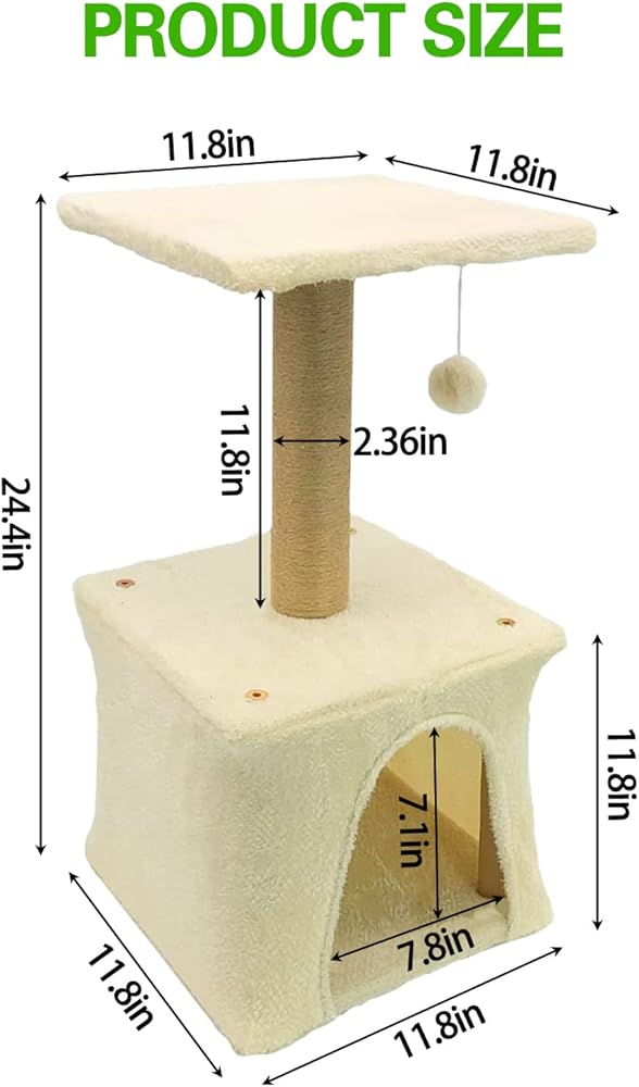 😻UNIQUE 3-IN-1 CAT TOWER - Cat tree with scratching post, platform and cave condo for indoor kittens to engage in climbing, hiding, resting and claw sharpening activities. Measuring 11.8x11.8x24.4 inches, it is more suitable for small and medium-sized indoor cats.