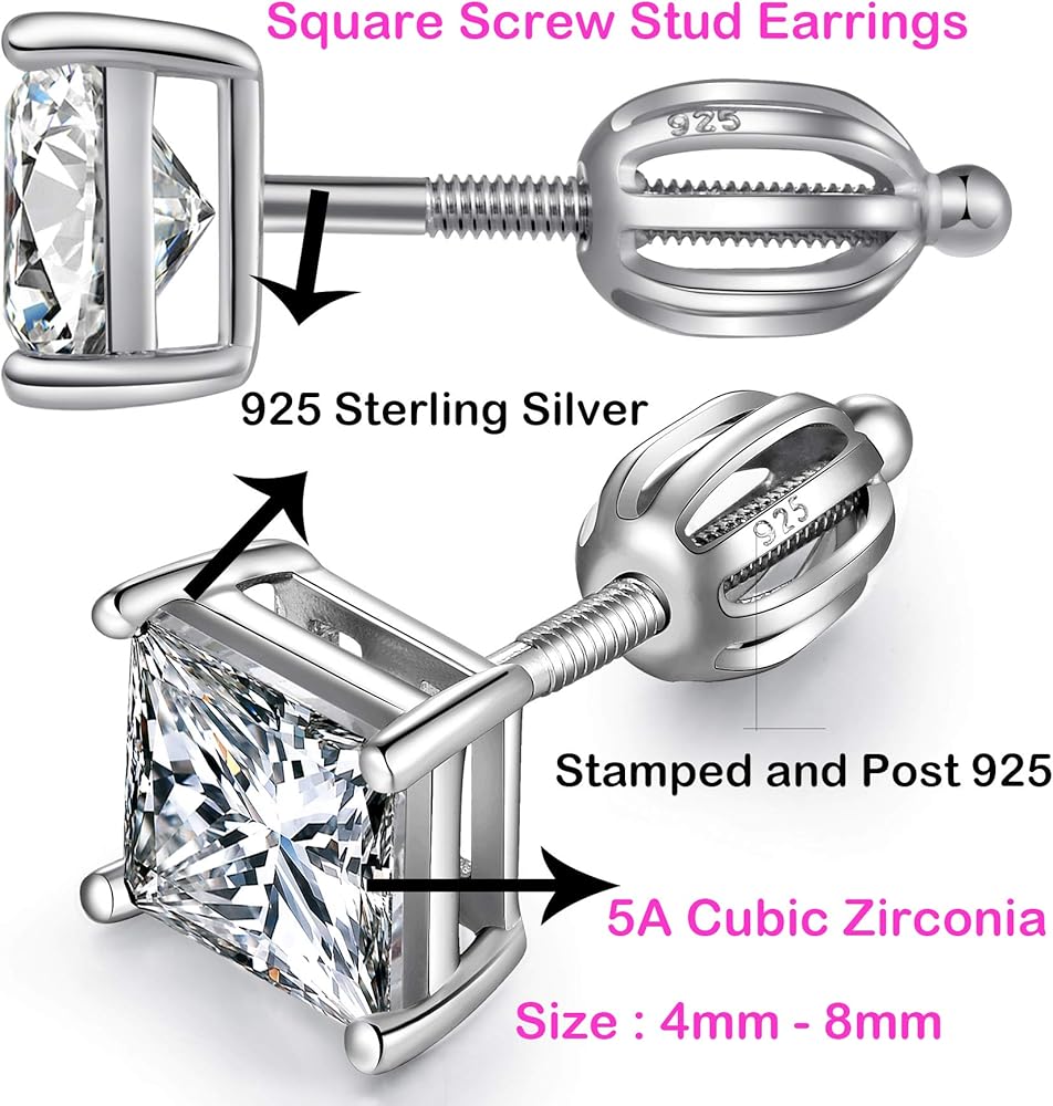 ❤.【Sterling Silver Stud Earrings】The Screw Stud Earrings are Made by Pure 925 Sterling Silver, White Gold Plated. Four-Prong Basket Settings and Locking Earring Backs from Solid 925 Sterling Silver. Stamped 925 on Scrolls and Posts.
